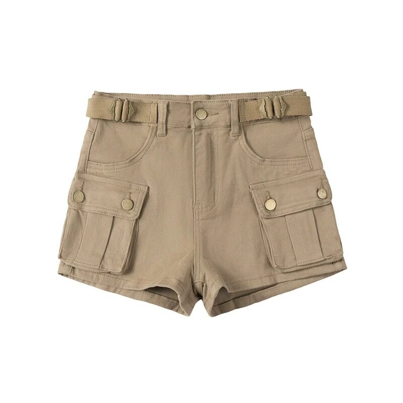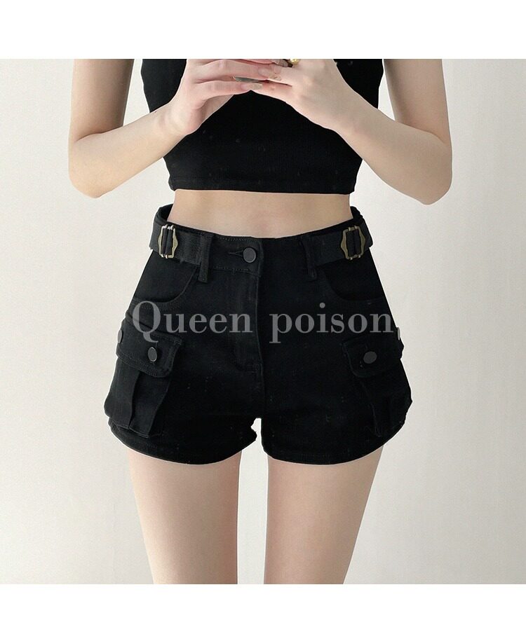 📚 辣酷到底腰带装饰工装牛仔短裤女夏高腰显瘦宽松休闲口袋阔腿热裤