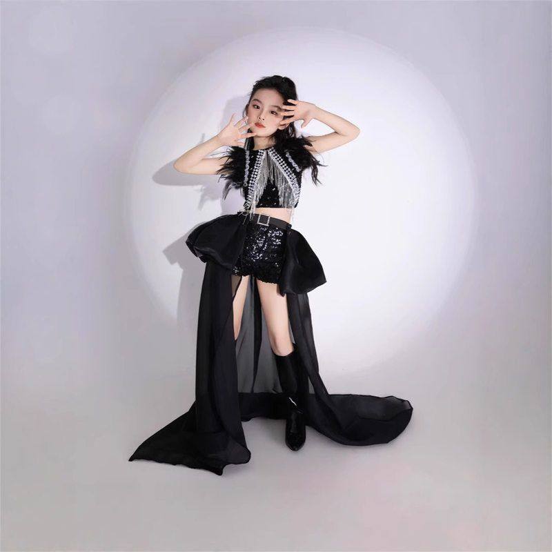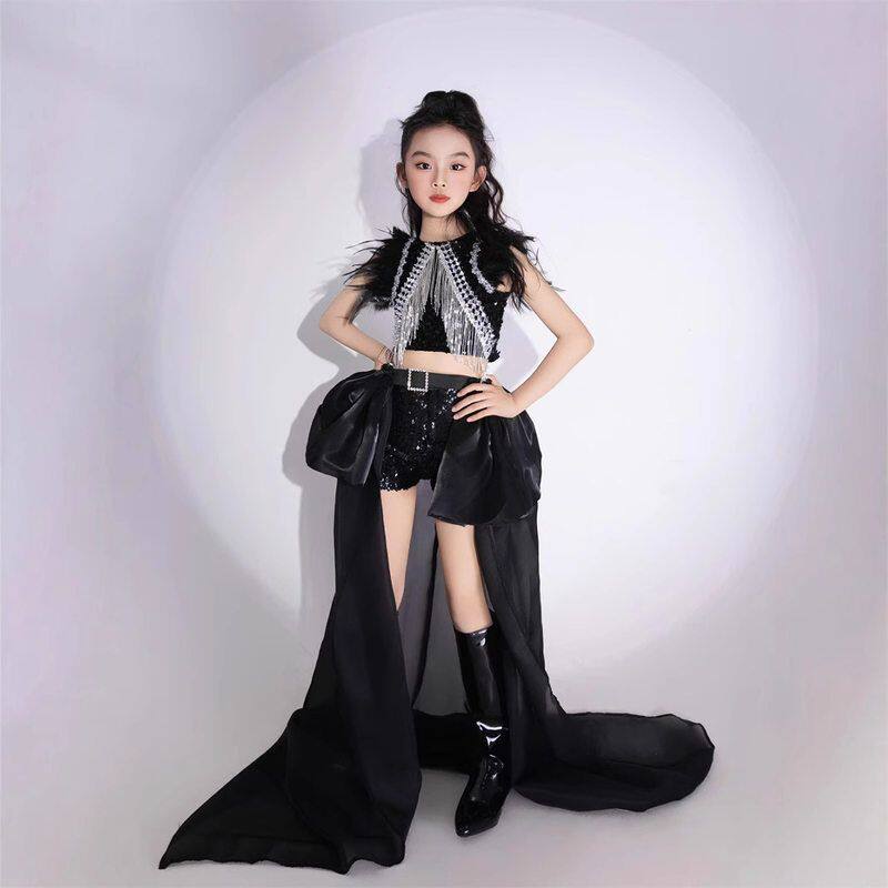 📚 女童走秀款潮服时尚个性高端礼服T台拖尾亮片黑色裙子PK赛演出服