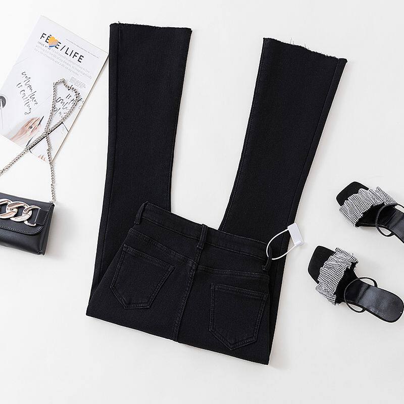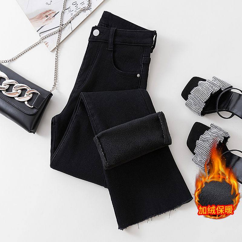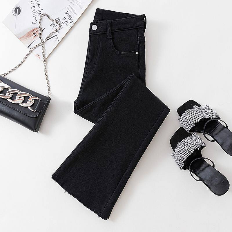 📚 145-150矮个子加绒加厚微喇裤子黑色显瘦女士极简风8分牛仔喇叭裤