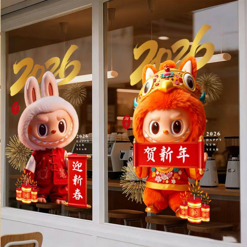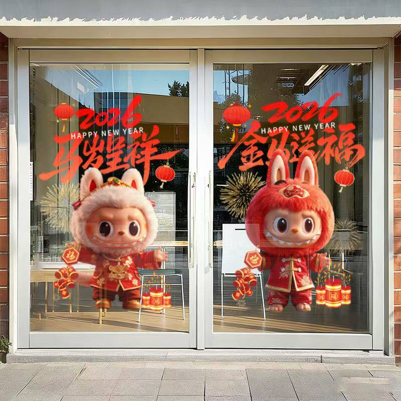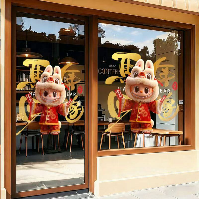 📚 卡通拉布布Labubu马年新年玻璃贴纸装饰布置商场玩具店铺橱窗氛围