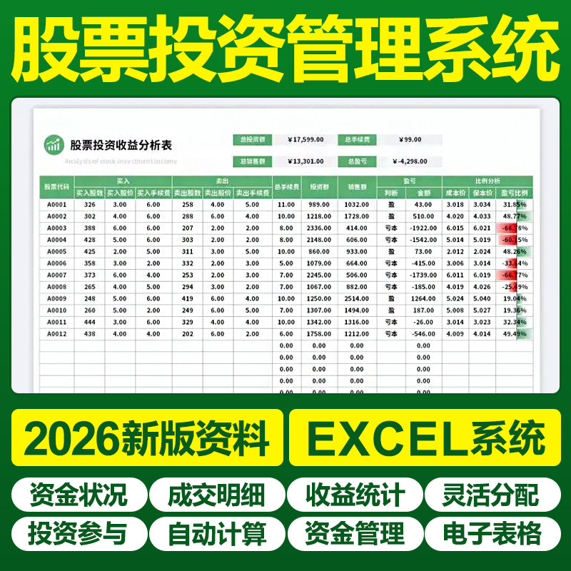 📚 excel股票投资交易管理表格记录分析收益计算器盈亏统计对账模板