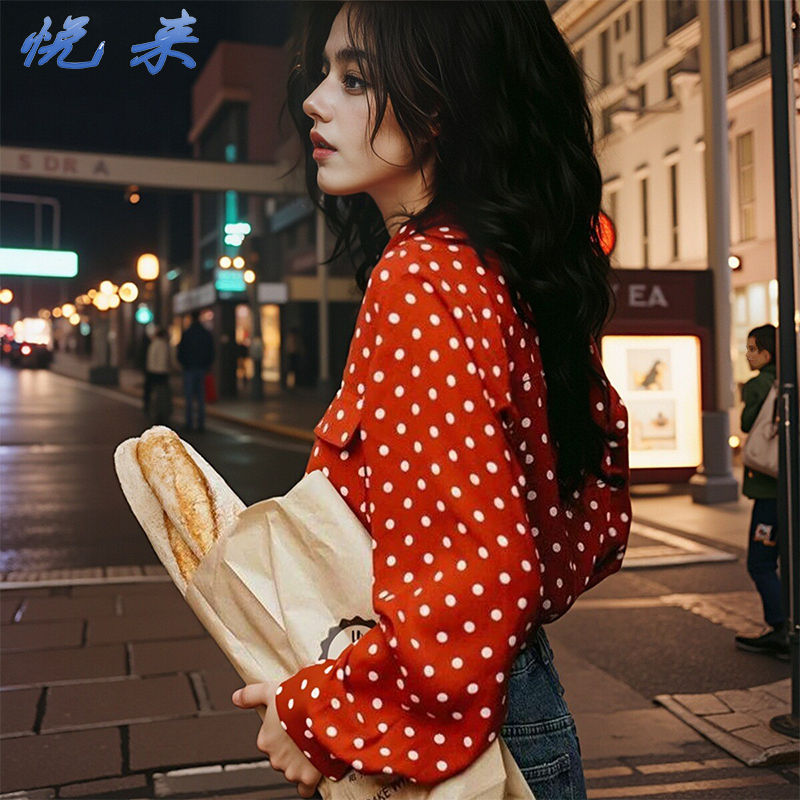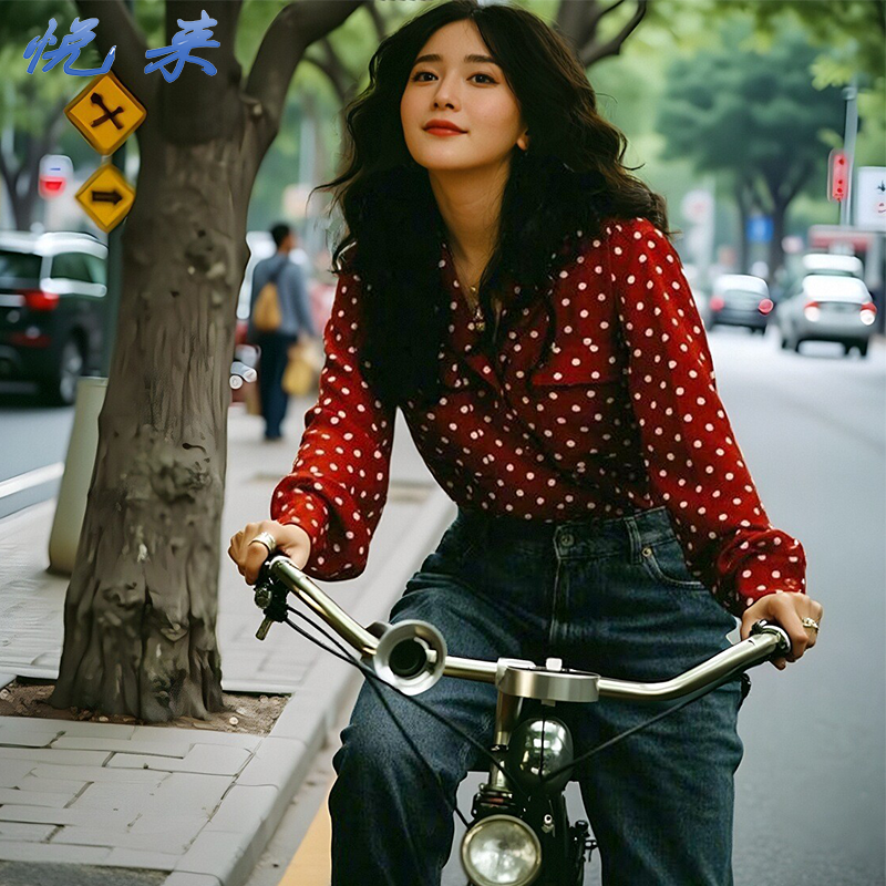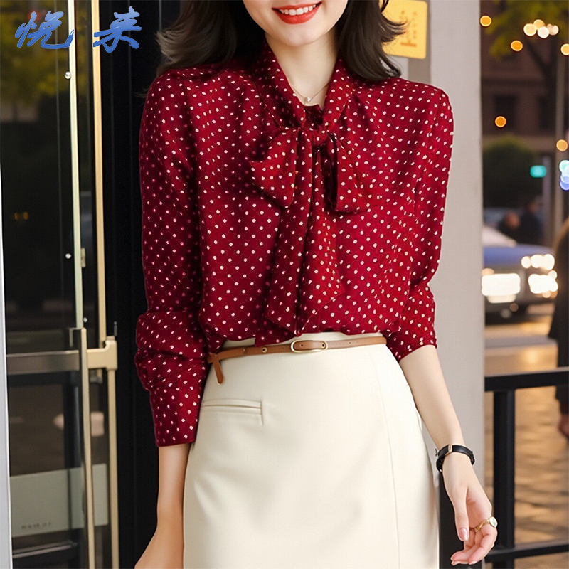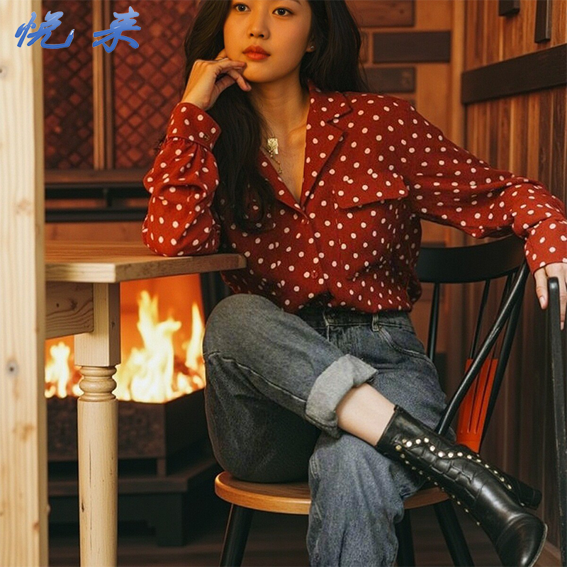 📚 阚清子同款复古港风波点衬衫女2025春秋酒红色长袖衬衣服西装领