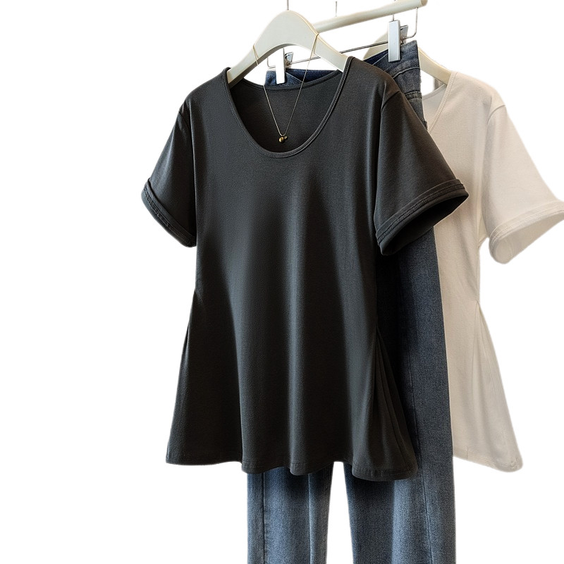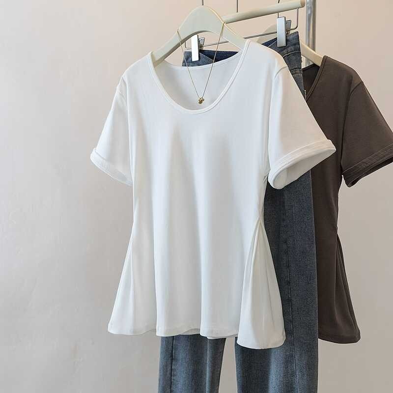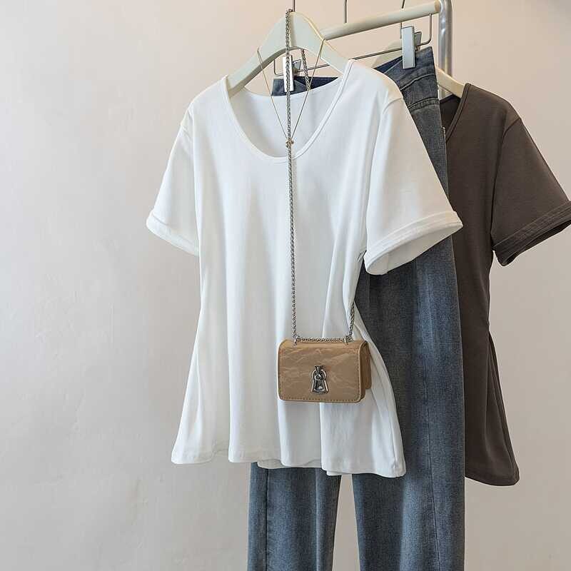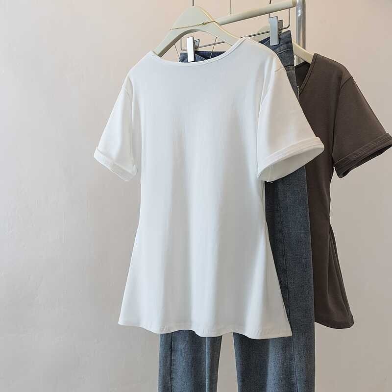 📚 300斤大码女装夏季收腰遮肚子正肩短袖T恤胖mm显瘦高级感洋气上衣