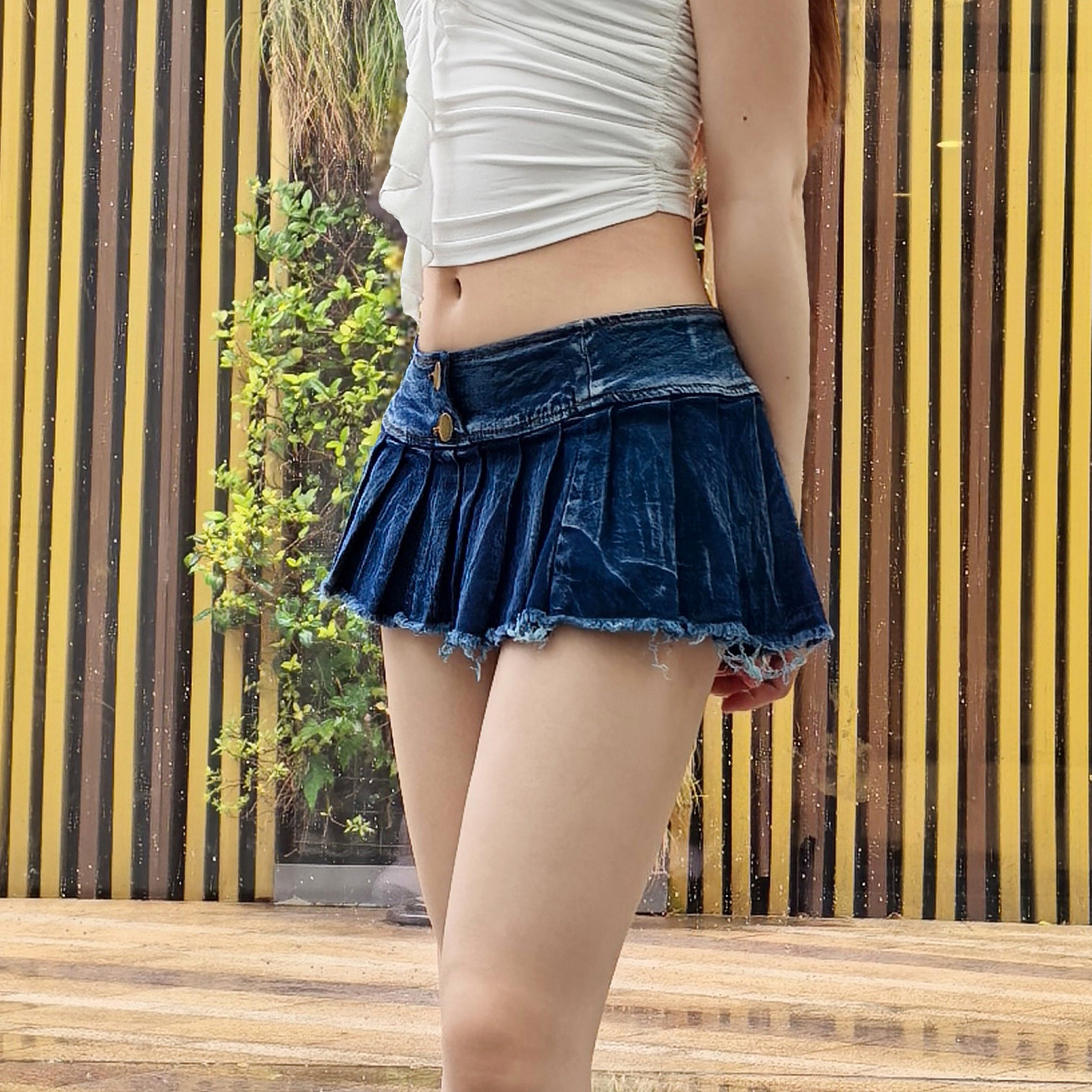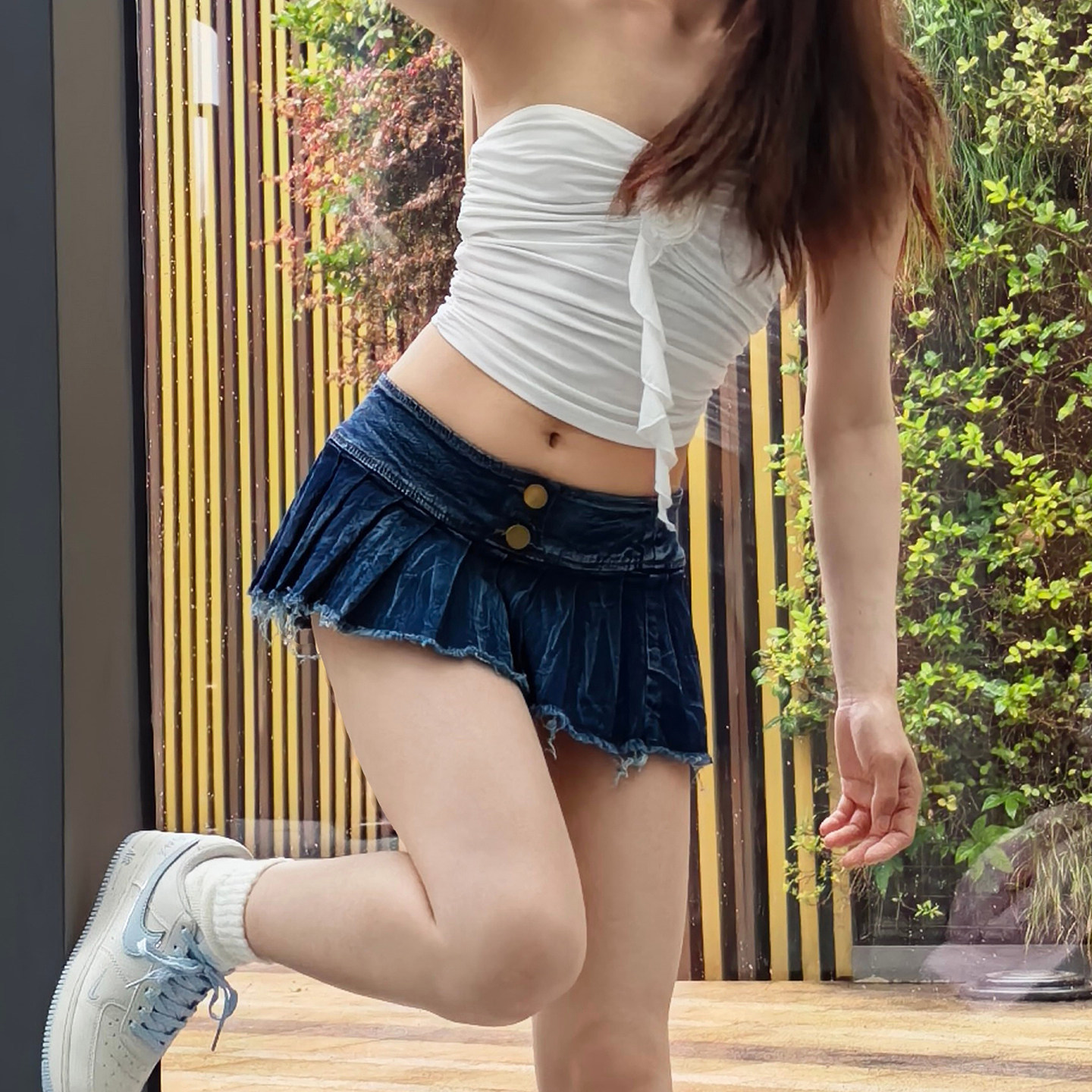 📚 DaLian 高阶版*25cm超短无内衬牛仔百褶裙性感低腰弹力蓝色半身裙