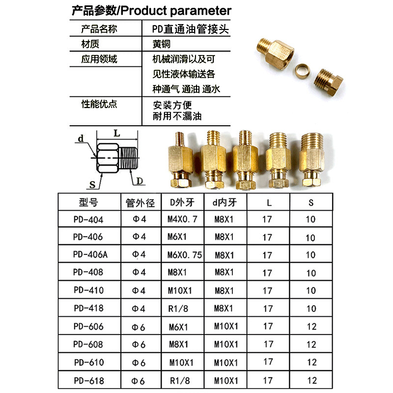 📚 PD油管直通接头尼龙管铝铜管卡套式油管接头机床滑块导轨润滑油嘴