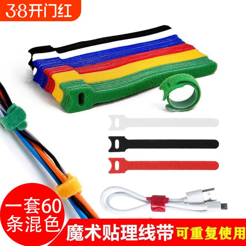 📚 自粘魔术贴背对背理线带猫头针型带孔位防脱落绑线带黑白蓝绿扎带