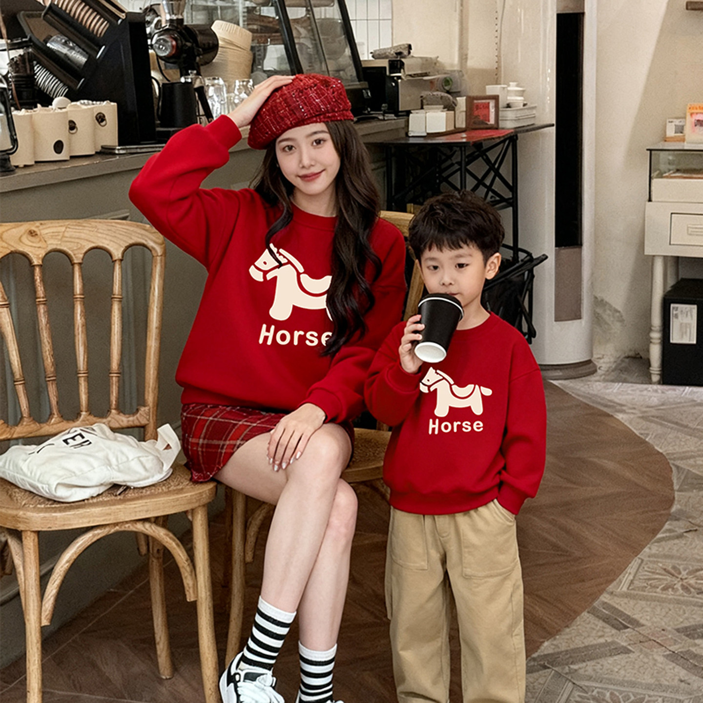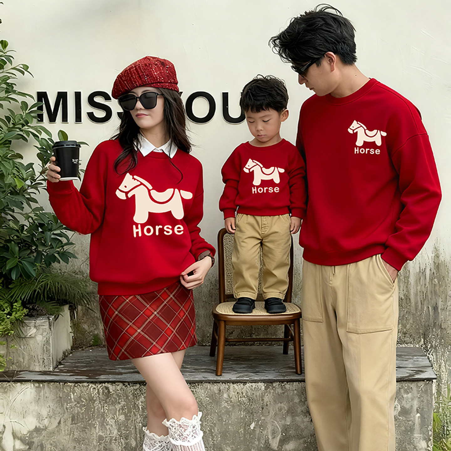 📚 亲子装秋冬装红色马年卫衣全家福一家三四口家庭装母女春节过年服