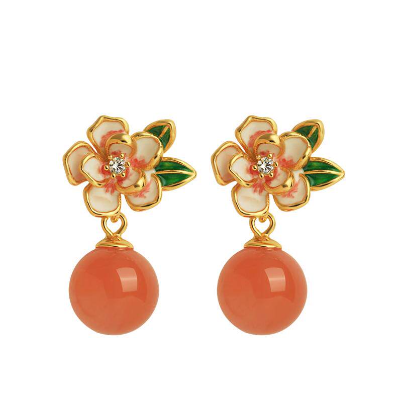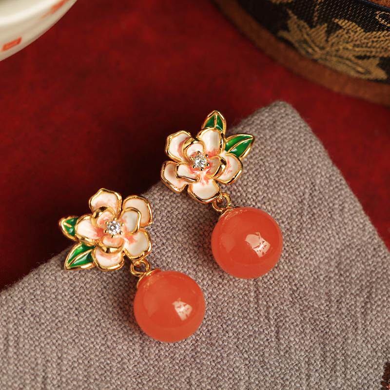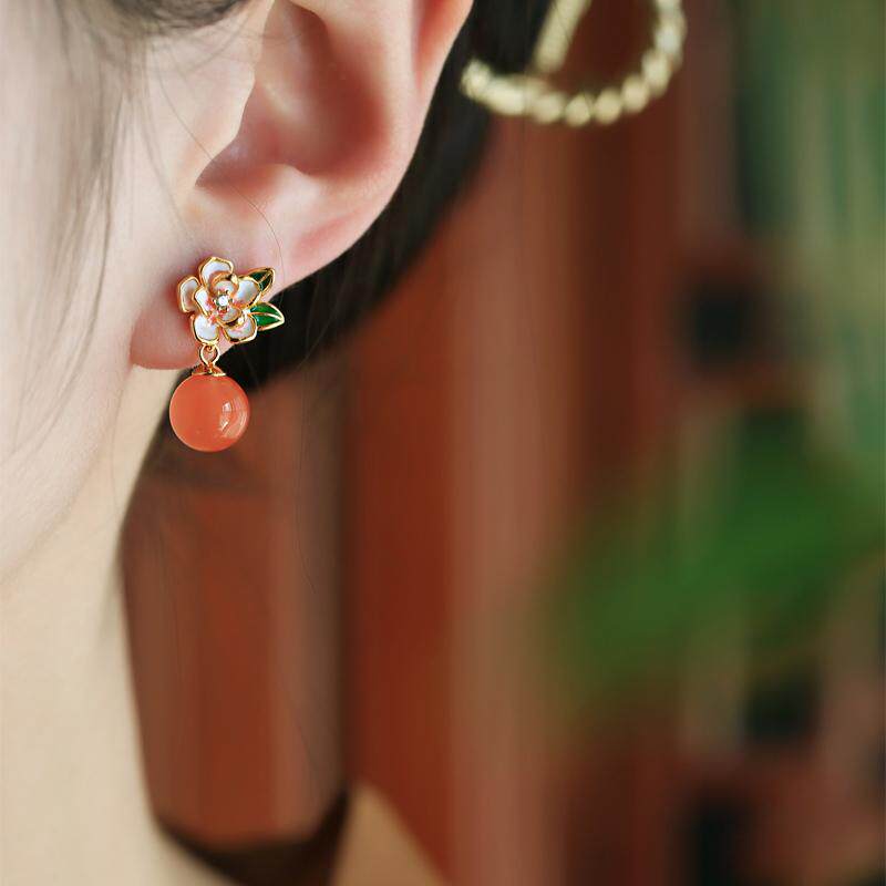 📚 小银匠天然南红耳饰纯银珐琅山茶花耳环女新中式国风红色耳钉耳坠