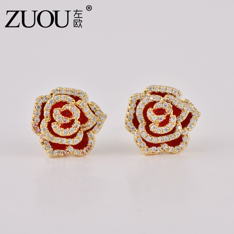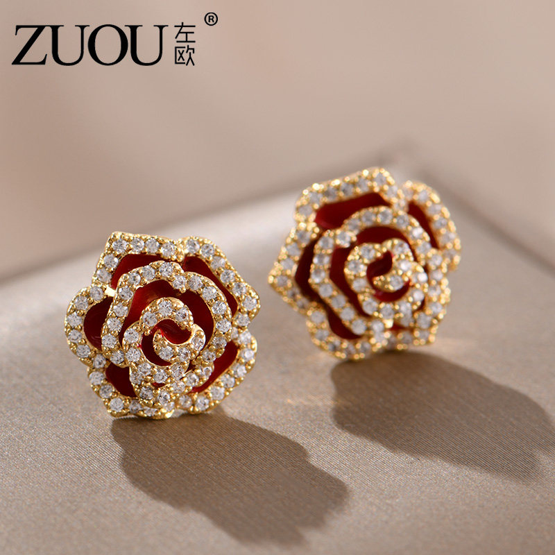 📚 红色山茶花耳钉女小香风满钻耳饰气质925银针高级感耳环小巧精致