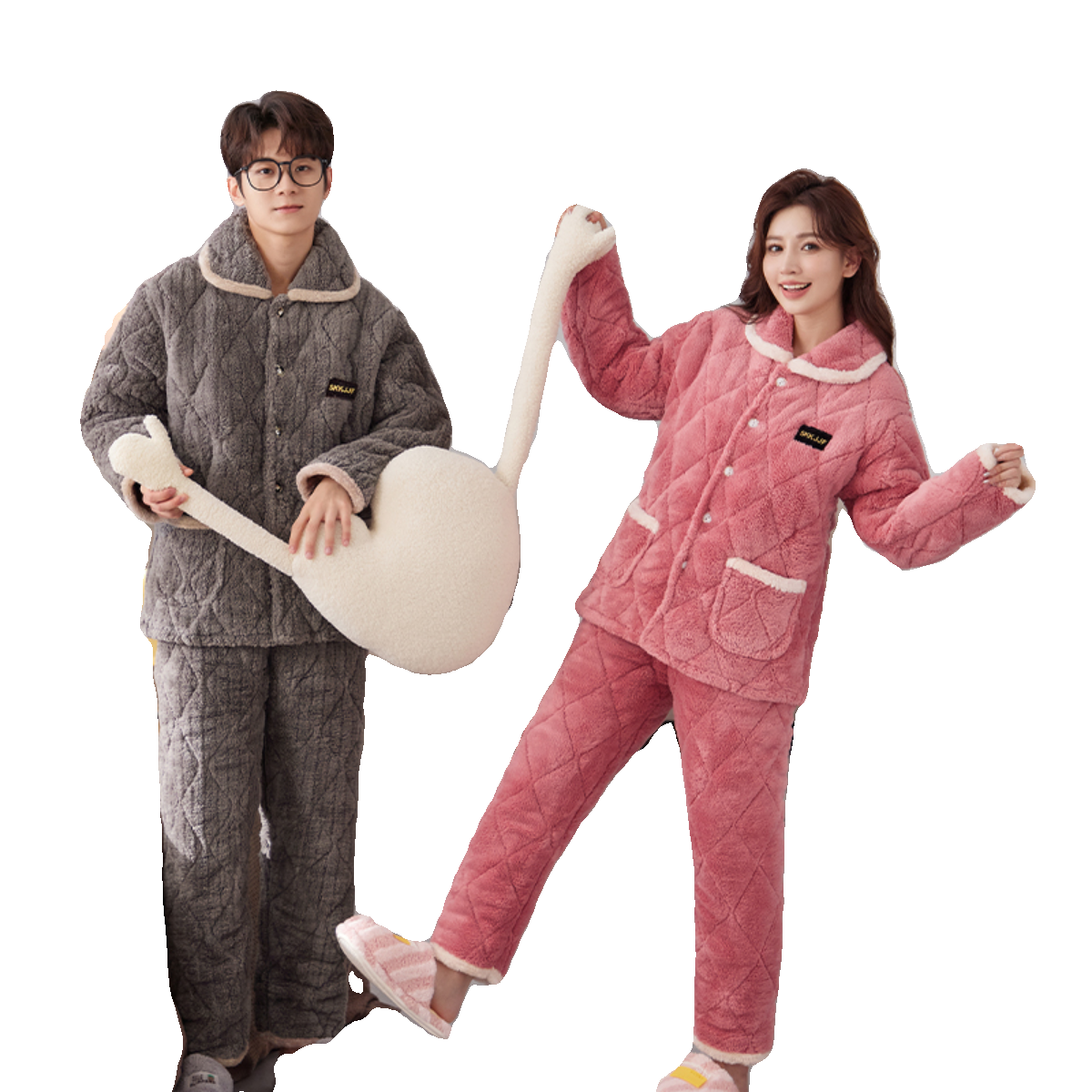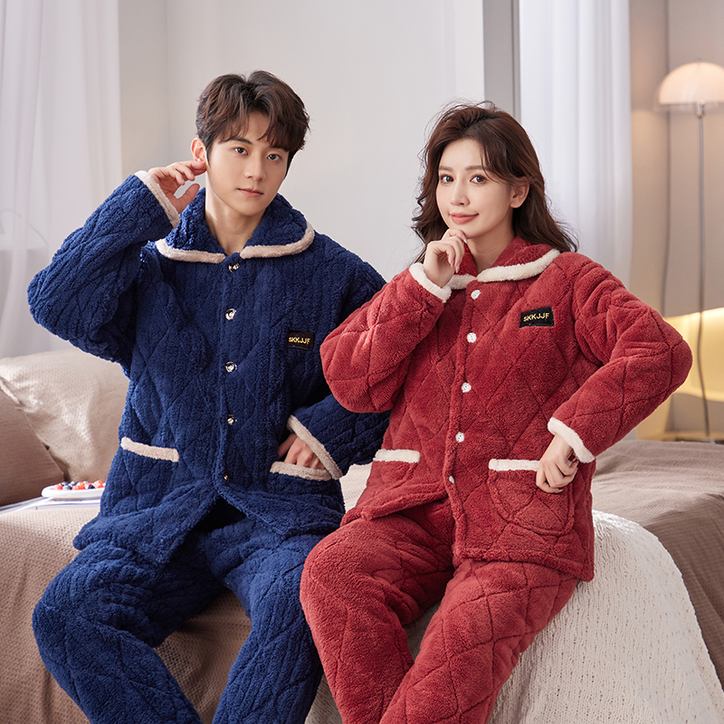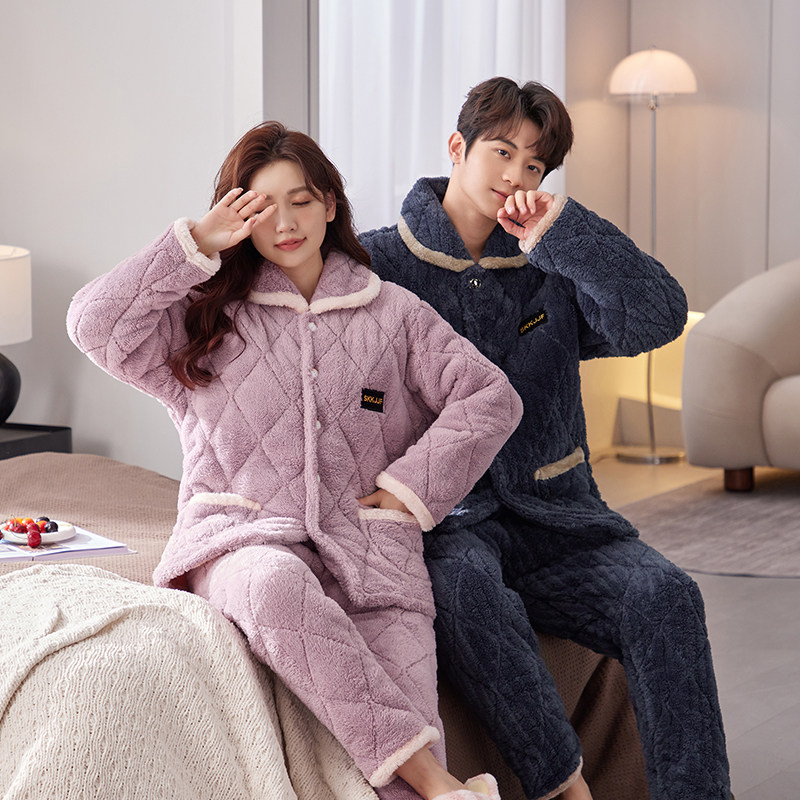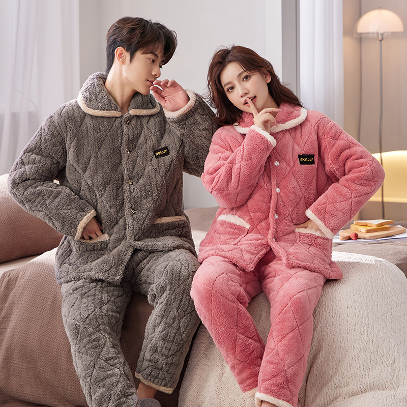 📚 睡衣冬三层加厚夹棉加绒保暖法兰绒大码圆领可外穿情侣家居服套装