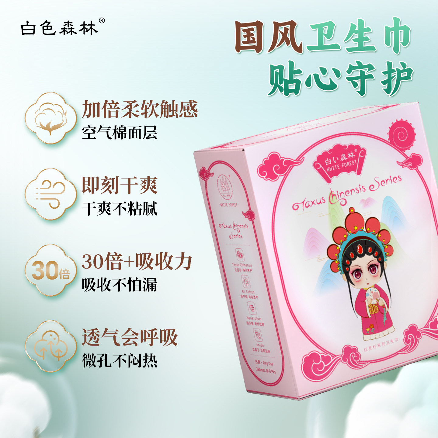 📚 白色森林国风红豆杉卫生巾医护级超薄透气姨妈巾日夜组合官方正品