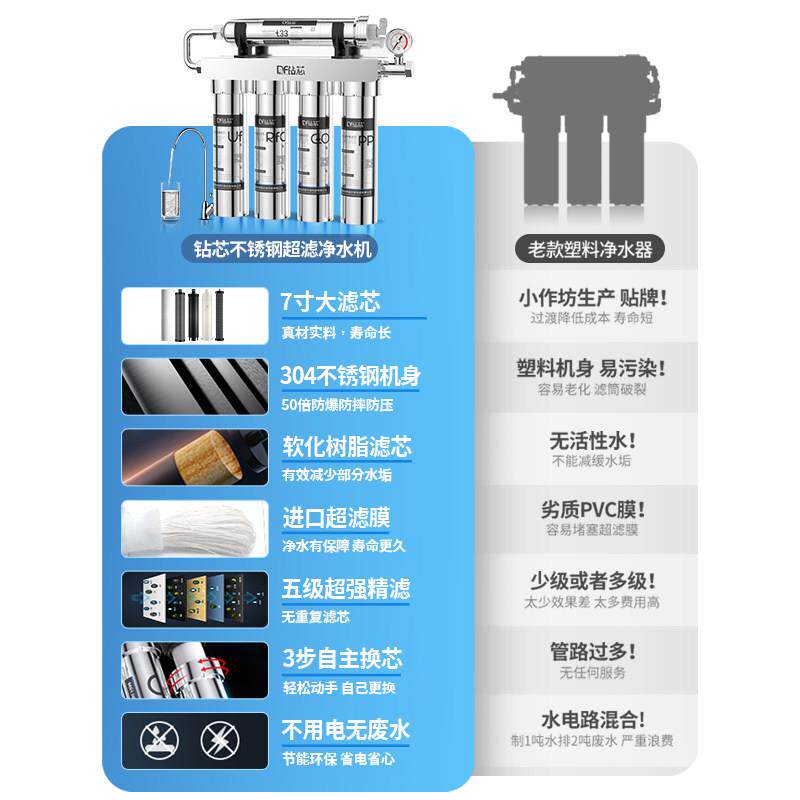 📚 钻芯净水器家用直饮厨房自来水前置过滤商用五级超滤不锈钢净水机