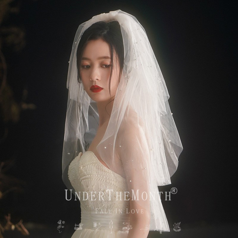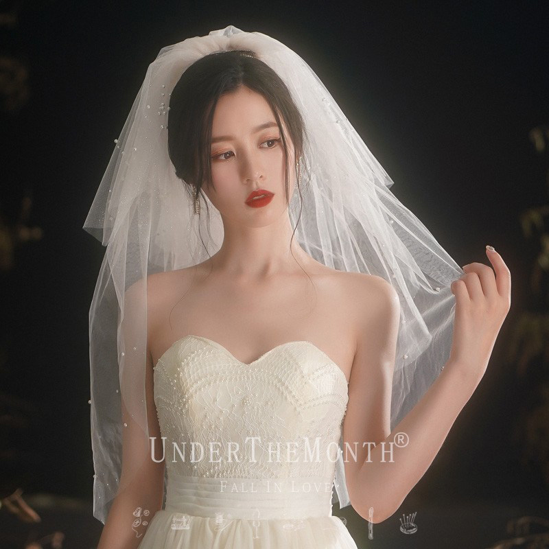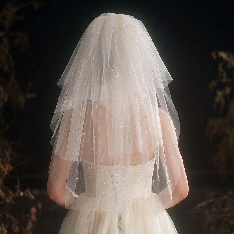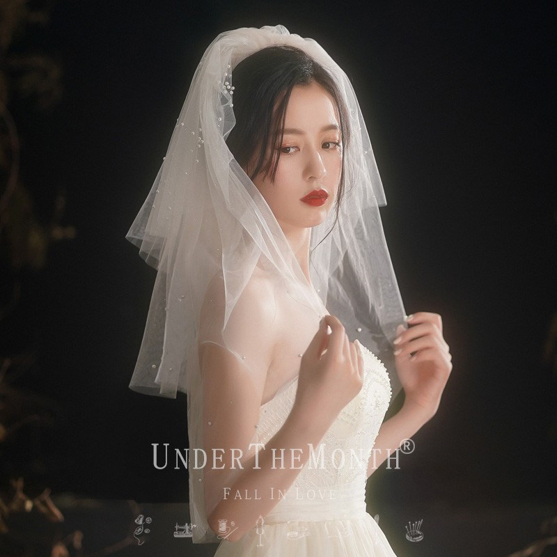 📚 新娘结婚主婚纱头纱浅香槟超仙森系网红拍照道具珍珠头纱头饰短款