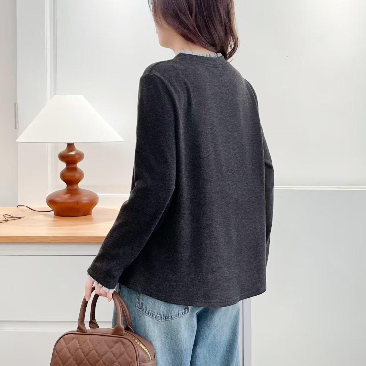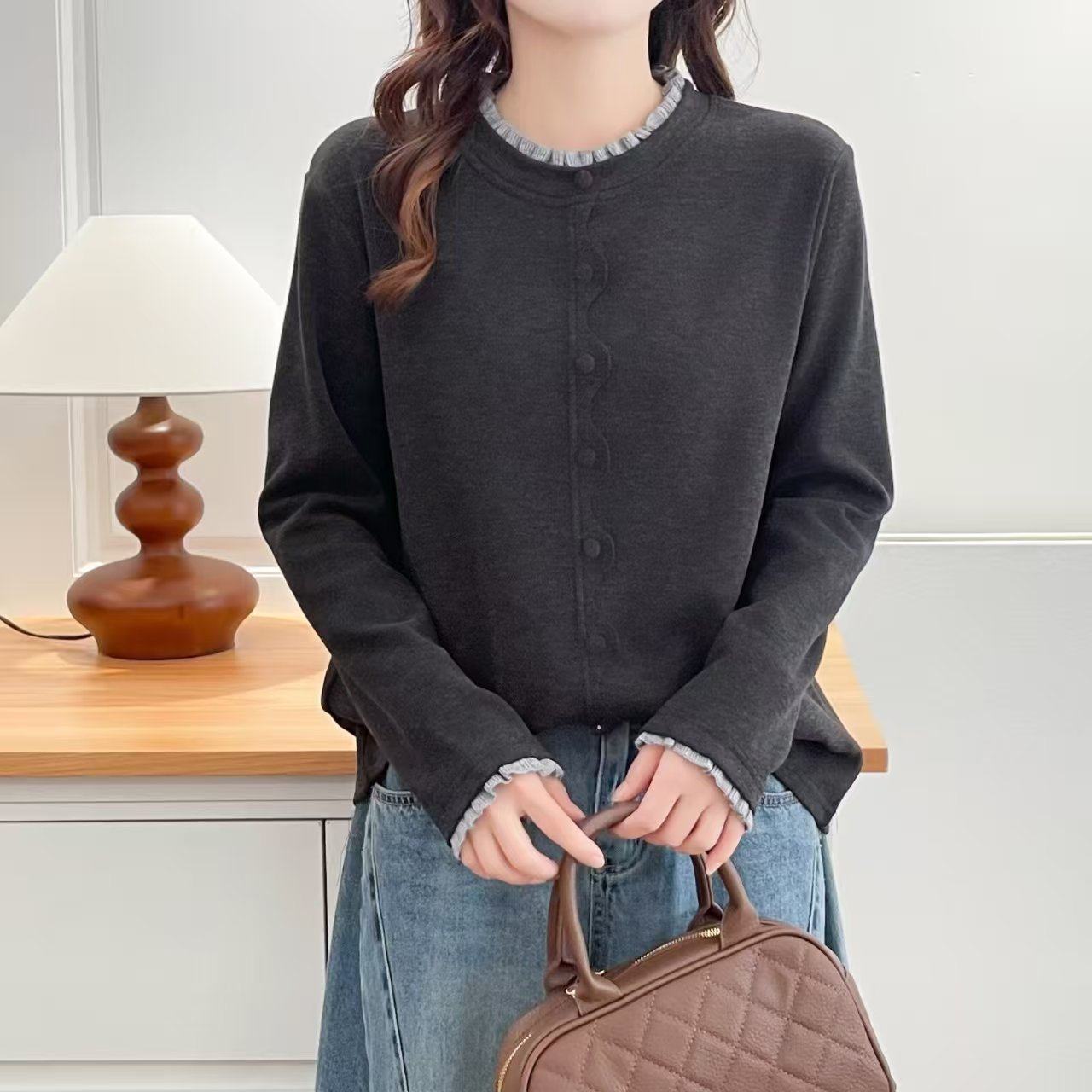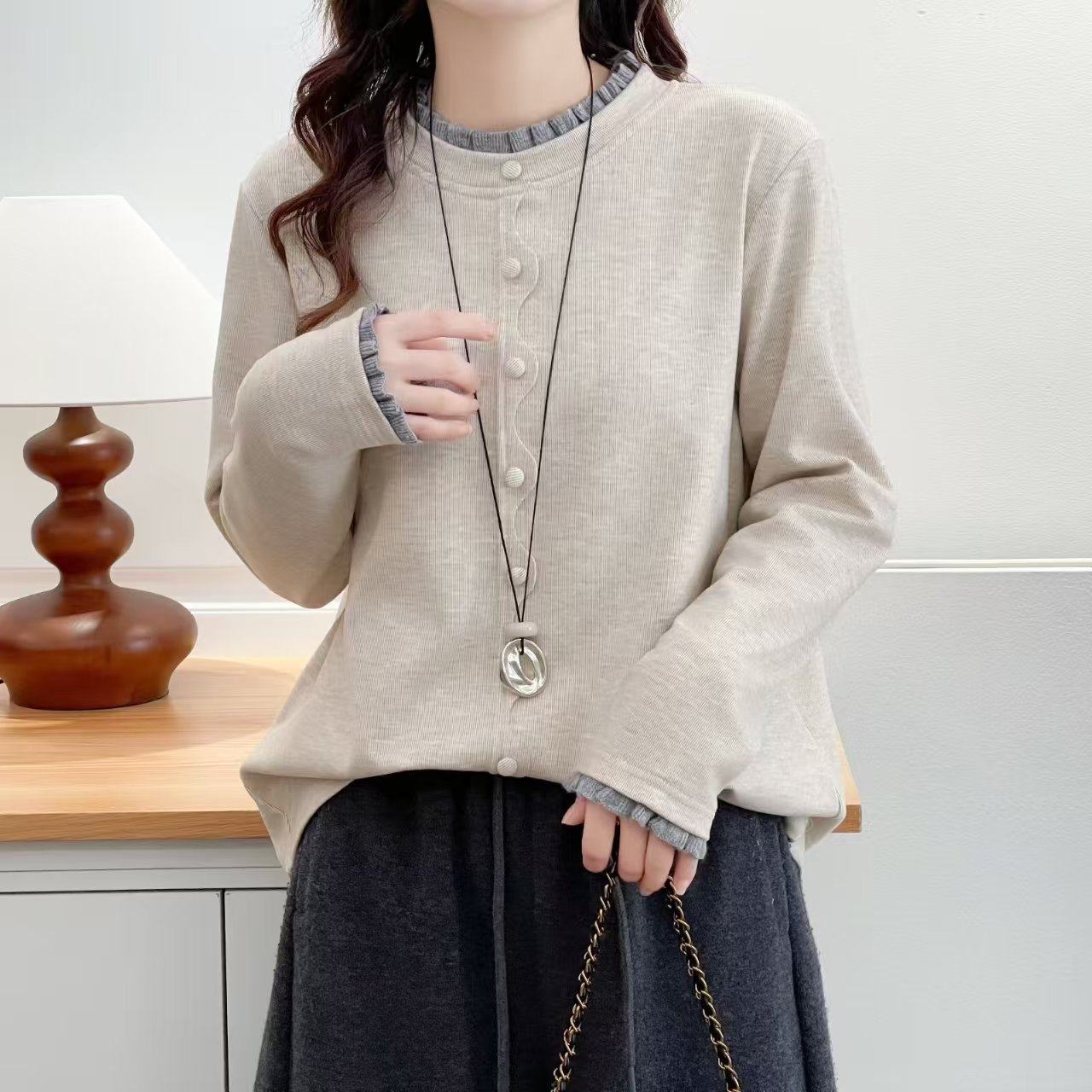 📚 韩系温柔入秋衣服胖mm加大码女装秋冬季拼色木耳领长袖T恤打底衫