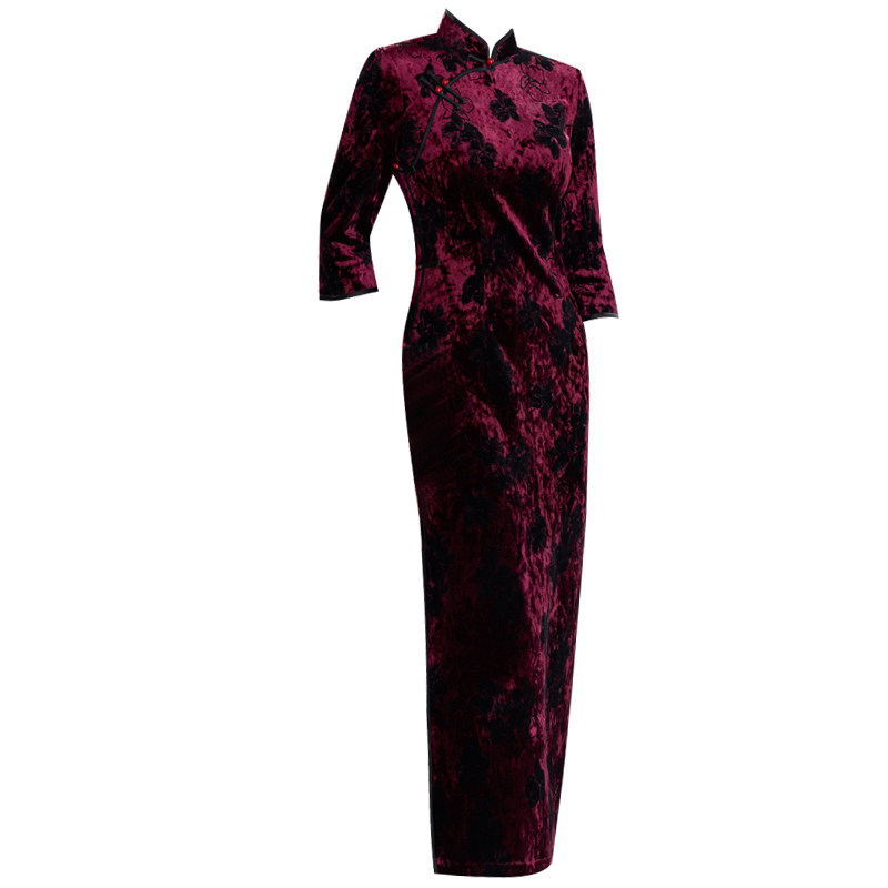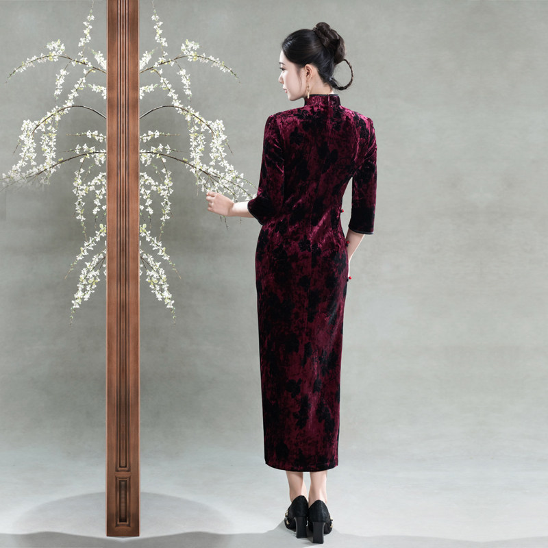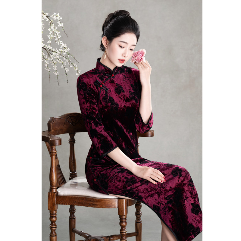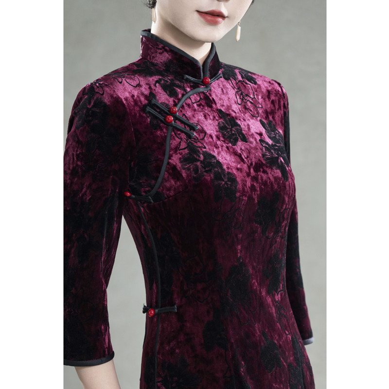 📚 紫红色旗袍气质年轻款中老年女妈妈弹力丝绒改良连衣裙秋冬装高级