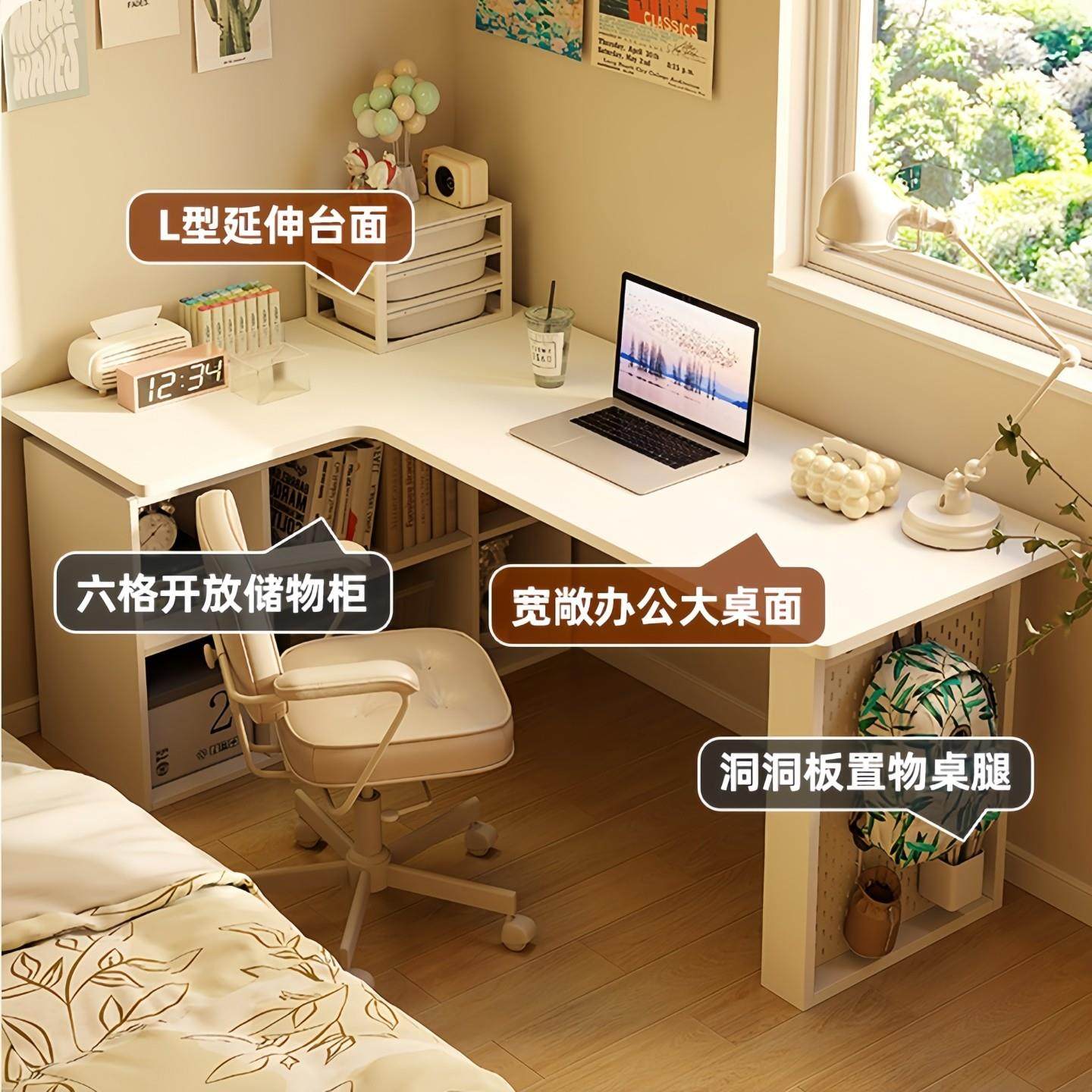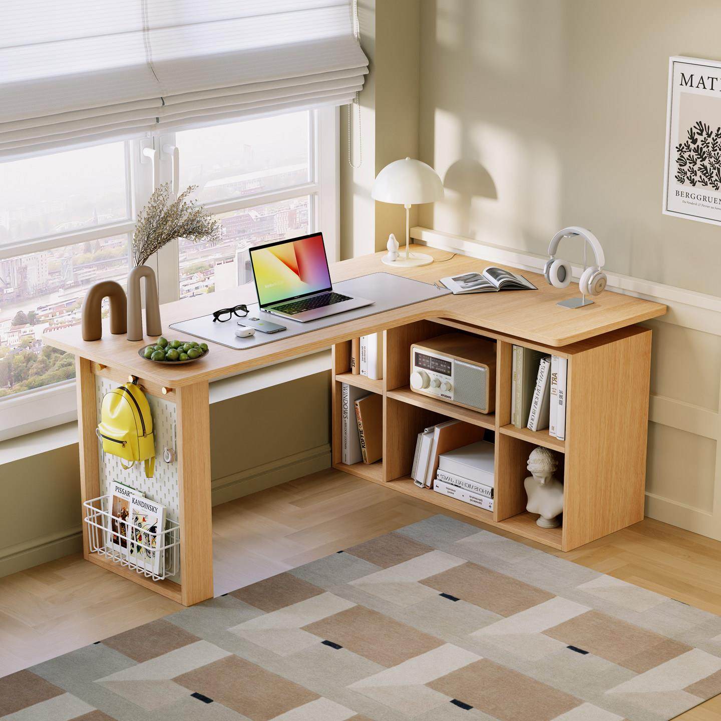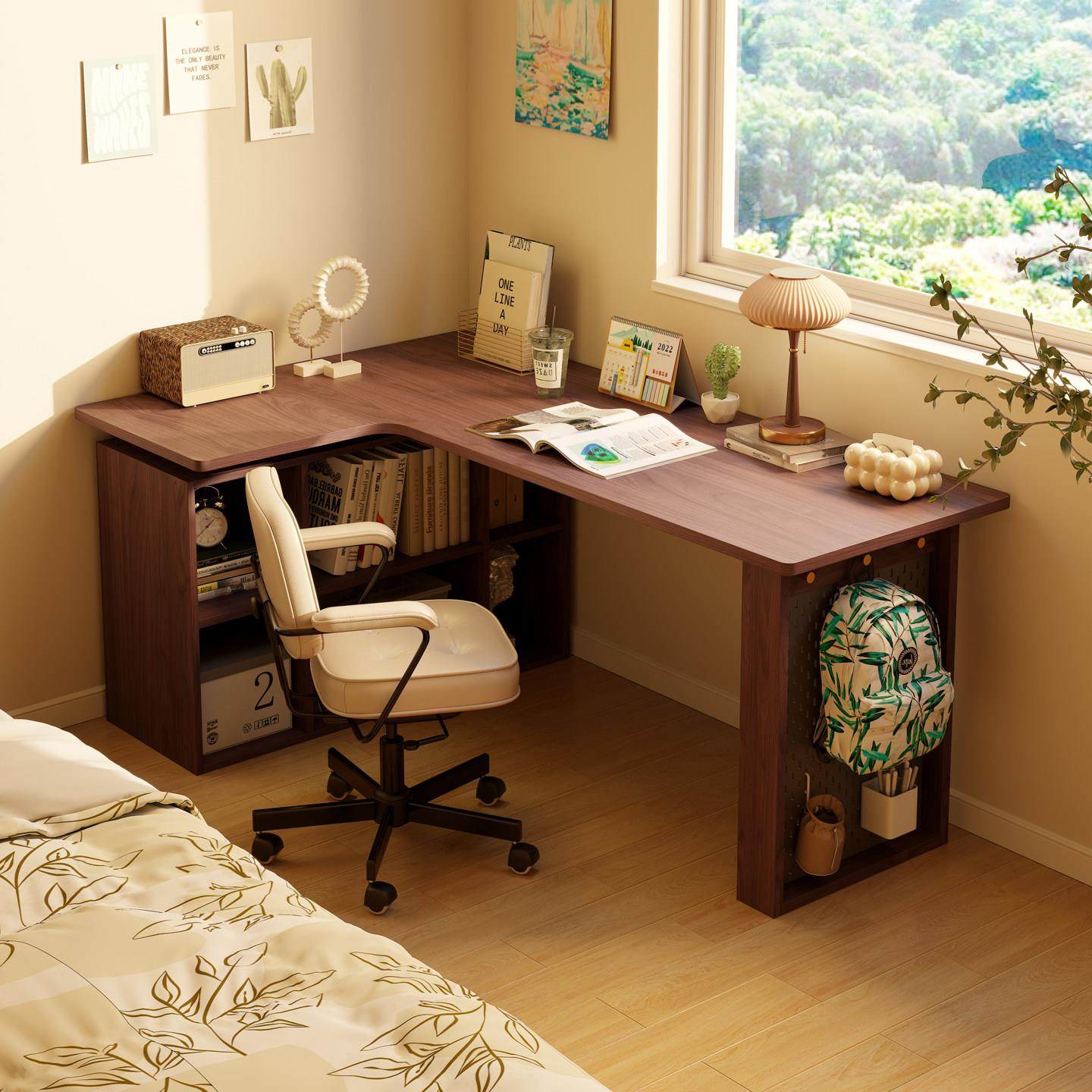 📚 卧室转角书桌书柜一体床边l型实木电脑桌书架组合 拐角式桌子靠窗