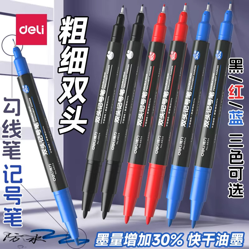 📚 得力小双头油性记号笔小头细头马克笔勾线笔儿童绘画学生用黑色美术生专用描边勾边笔彩色速干防水笔钩线钩画
