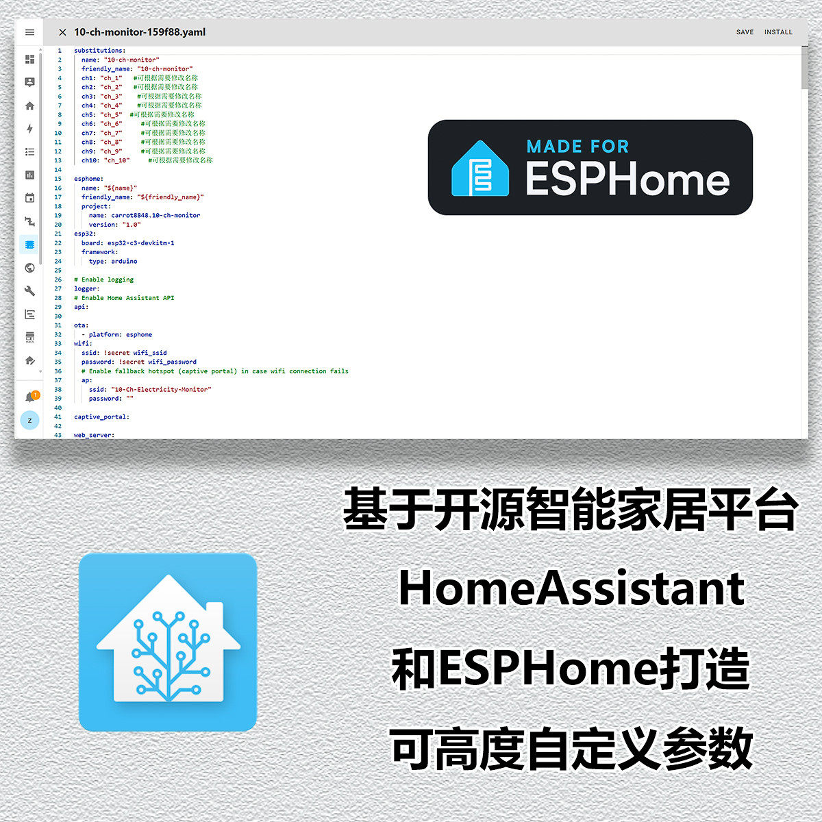 📚 10路高精度电量计量模块智能电表ESPhome固件支持HomeAssistant
