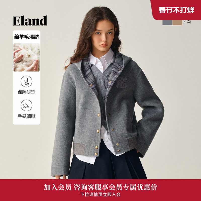 📚 【70%绵羊毛】Eland衣恋毛呢外套女时尚短款连帽大衣2025冬季新款