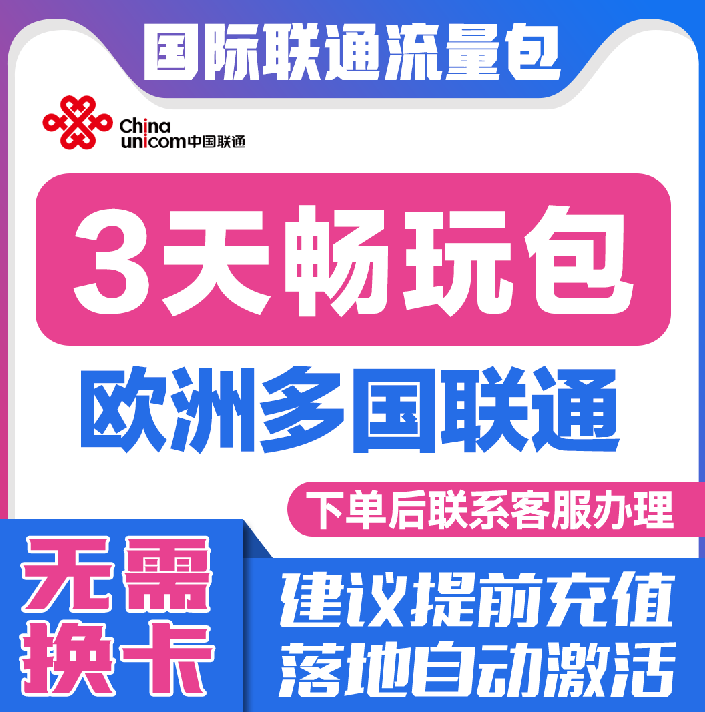 📚 中国联通国际漫游欧洲多国3天流量充值3日境外上网流量包无需换卡