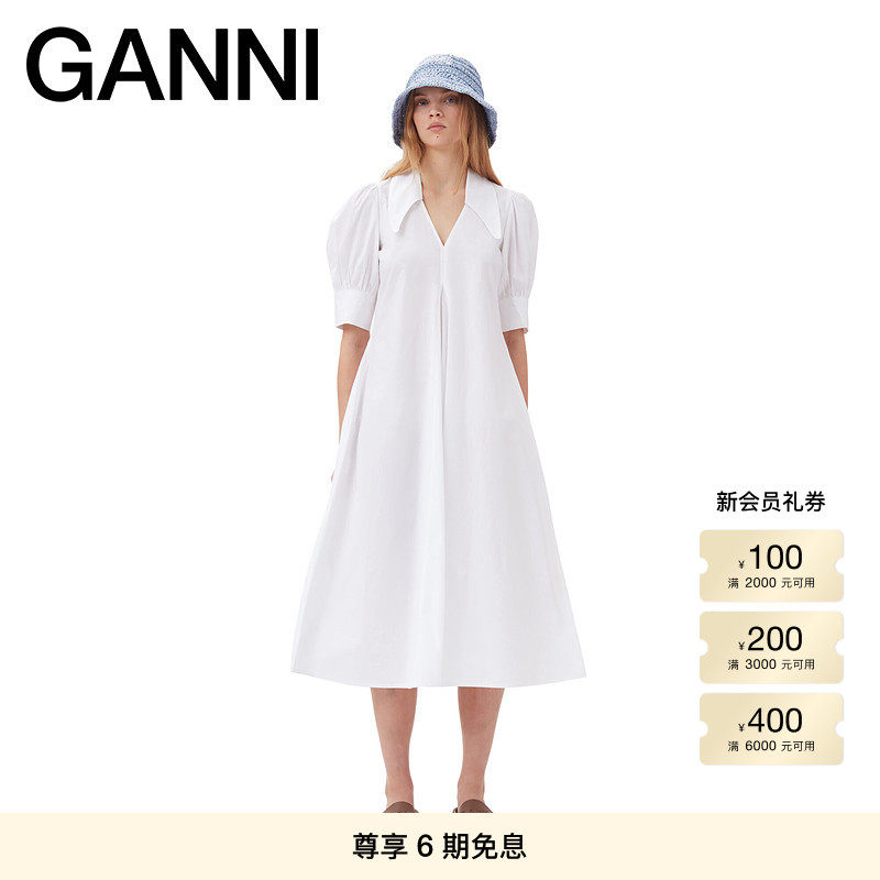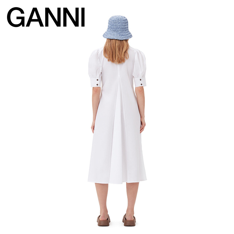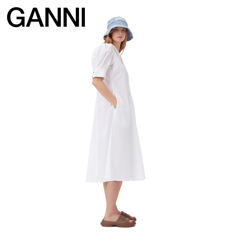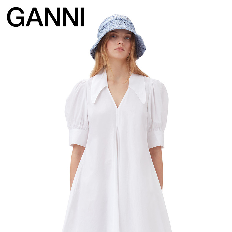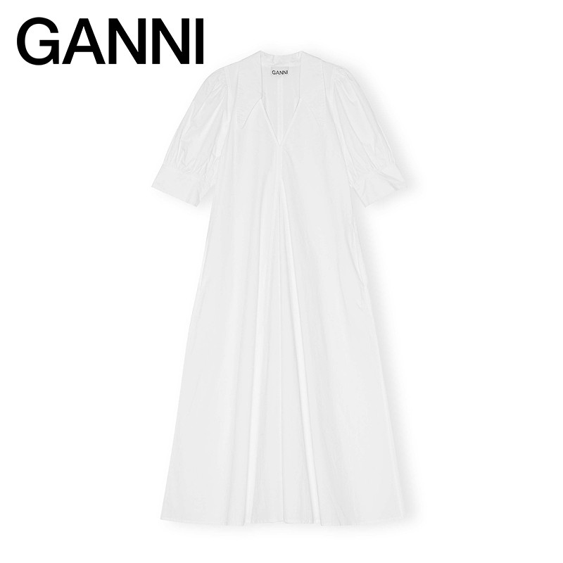 📚 GANNI女装 白色简约V领泡泡袖棉府绸连衣裙 F7127151