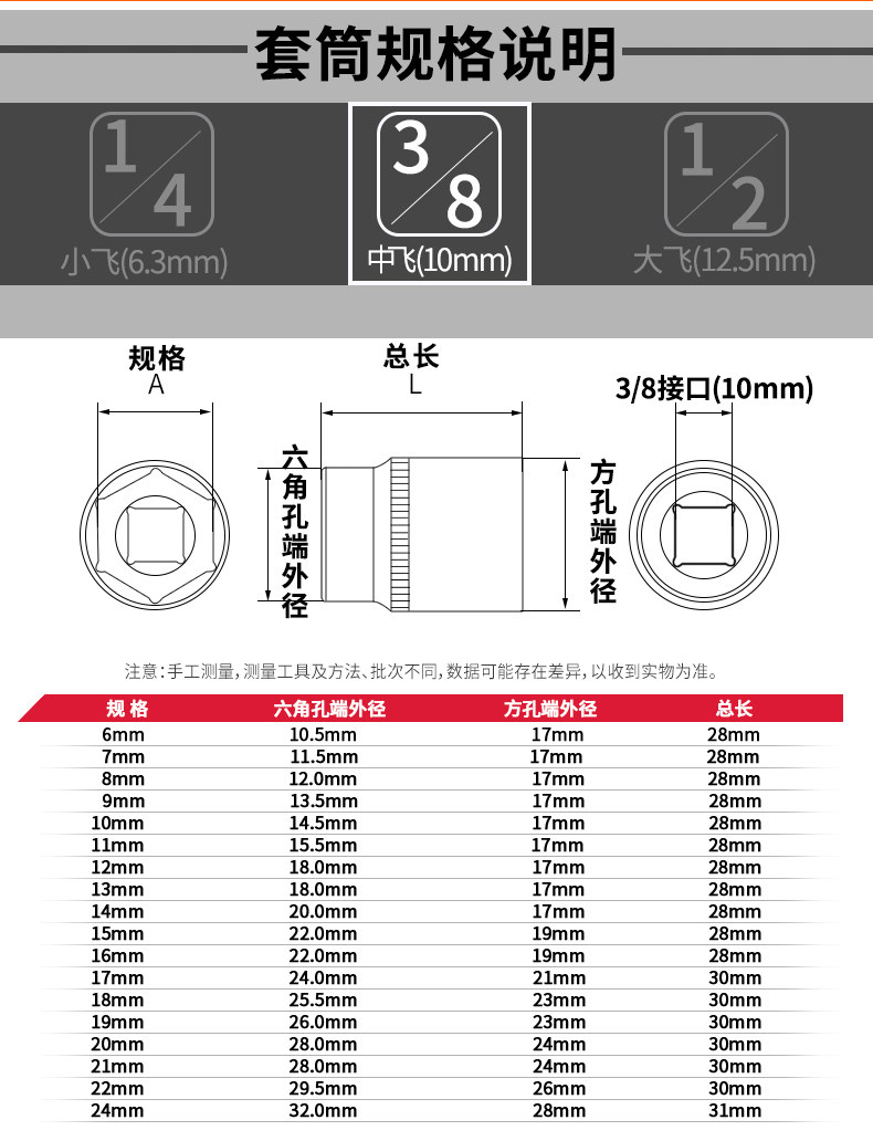📚 3/8中飞六角套筒头6/13/14/17/18/21/22/24mm单卖梅花空心套同子
