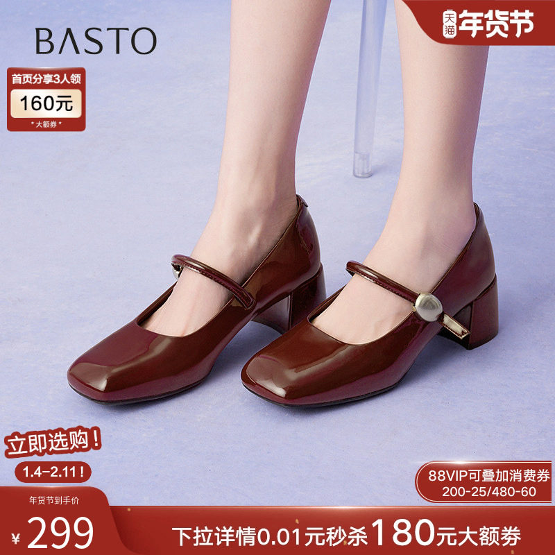 📚 百思图25秋商场新款法式红色玛丽珍鞋粗跟浅口女单鞋婚鞋F2166CQ5