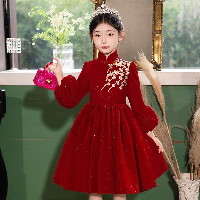 📚 红色冬季朗诵女童旗袍礼服裙小女孩表演服装儿童唐装拜年服女过年
