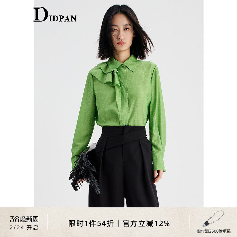 📚 IDPAN女装新款经典H版型不对称几何荷叶边设计长袖亚麻衬衫女