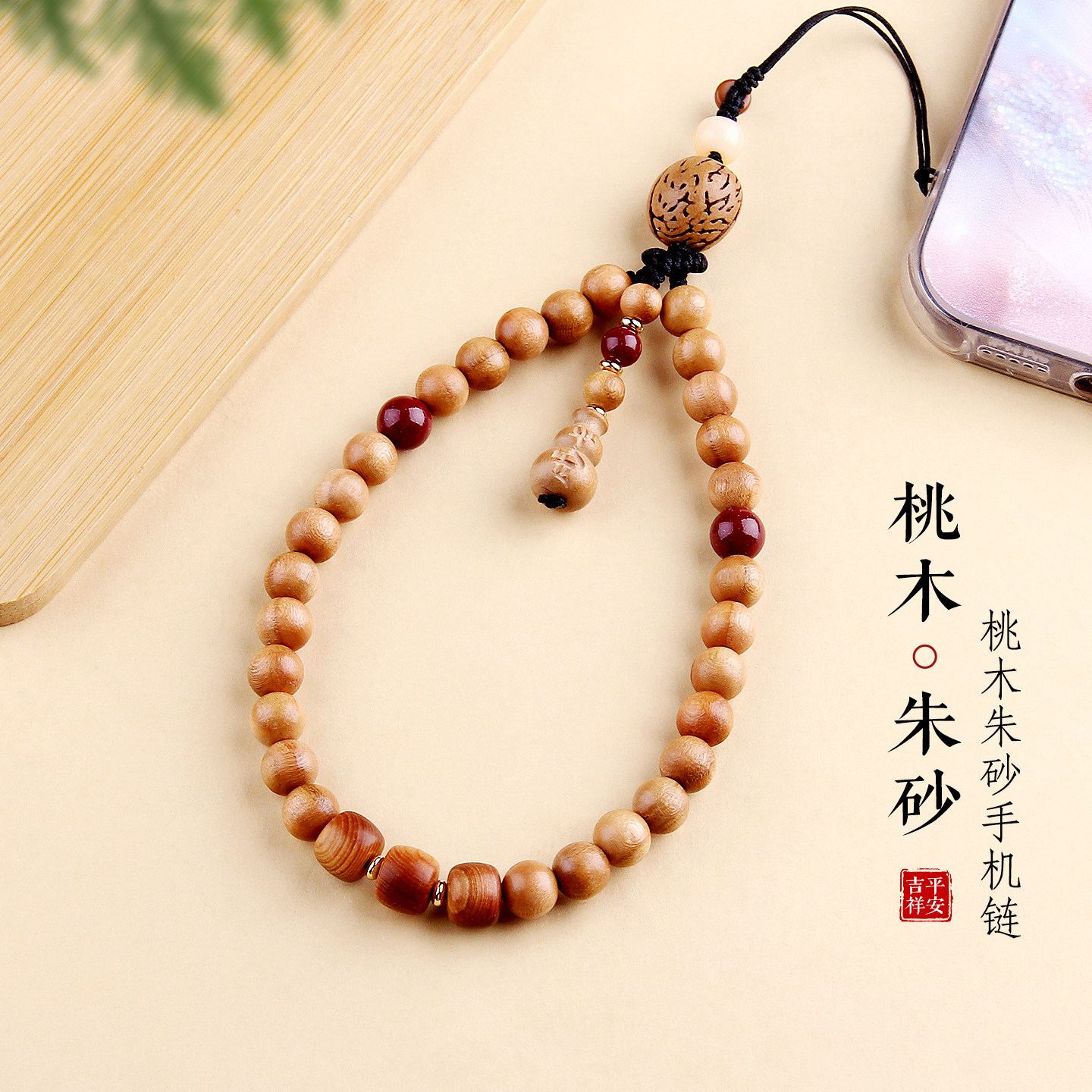 📚 野生老桃木手机链桃核挂件朱砂崖柏菩提挂饰手腕挂绳桃木平安葫芦