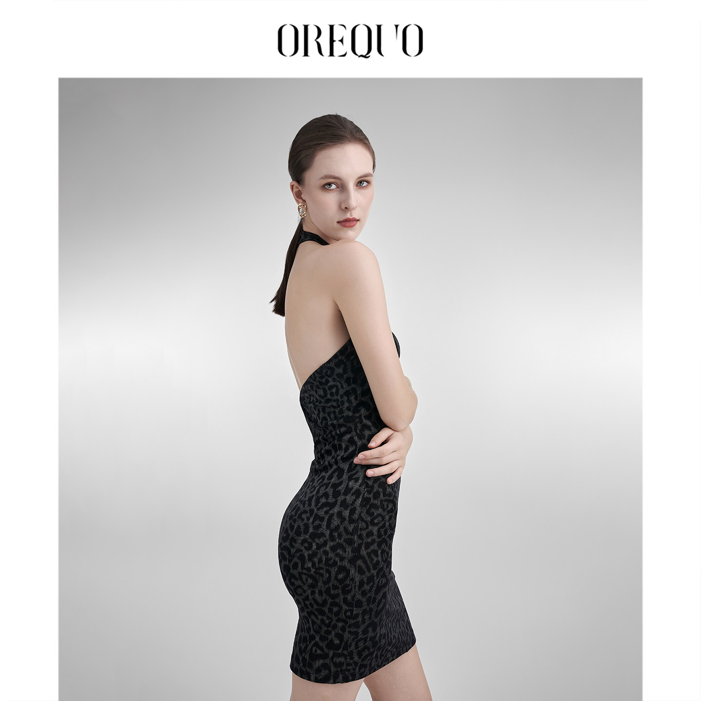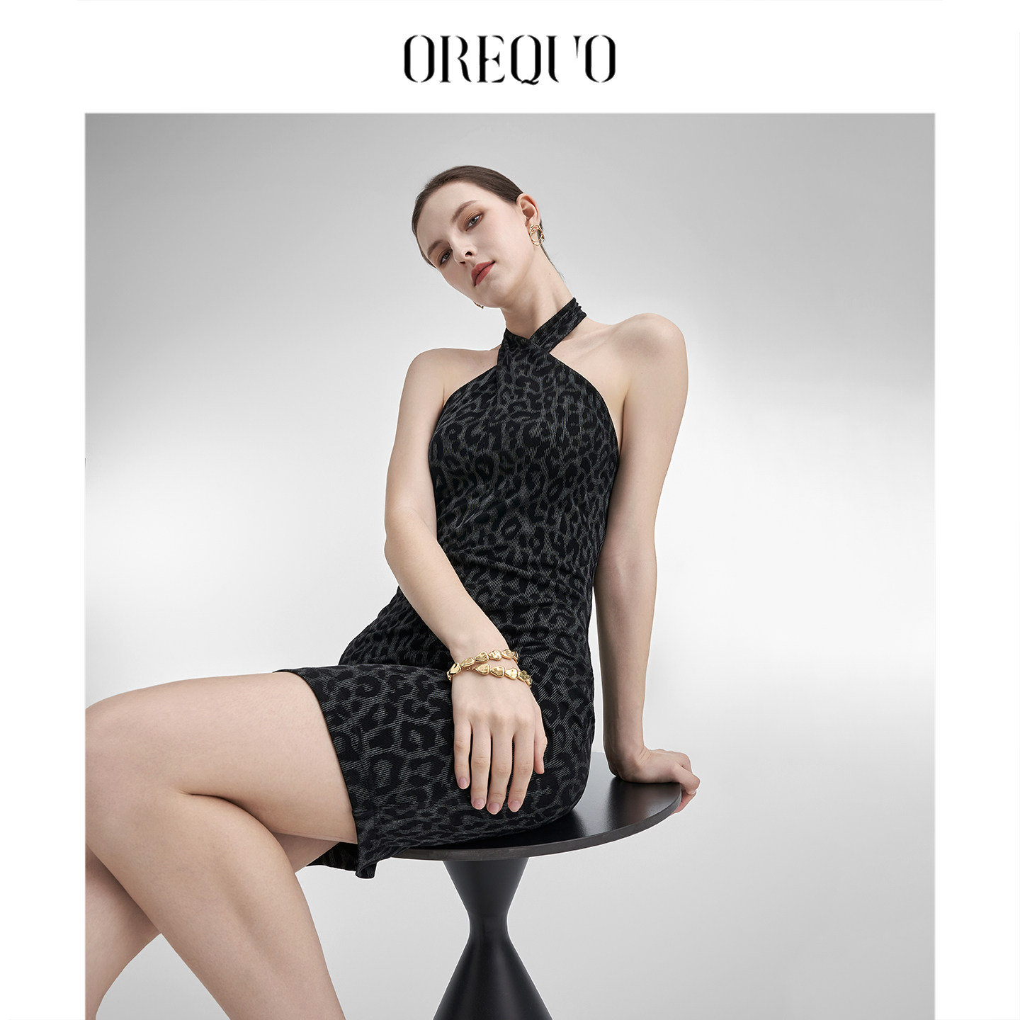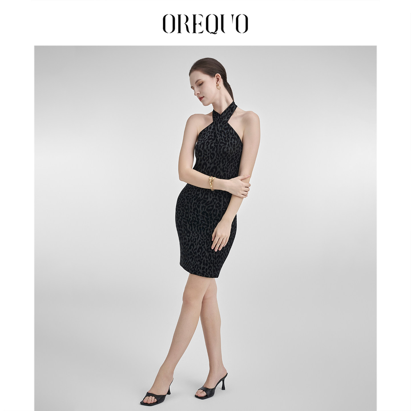 📚 【96%醋酸】OREQUO HOLIDAY交叉挂脖性感豹纹连衣裙女露背包臀裙