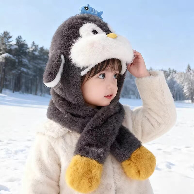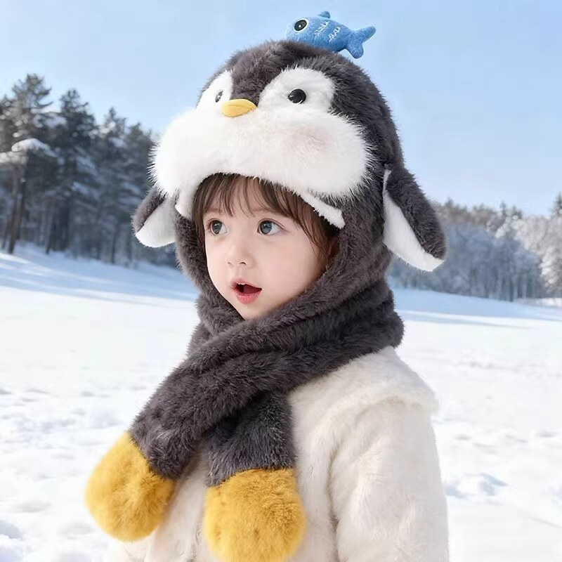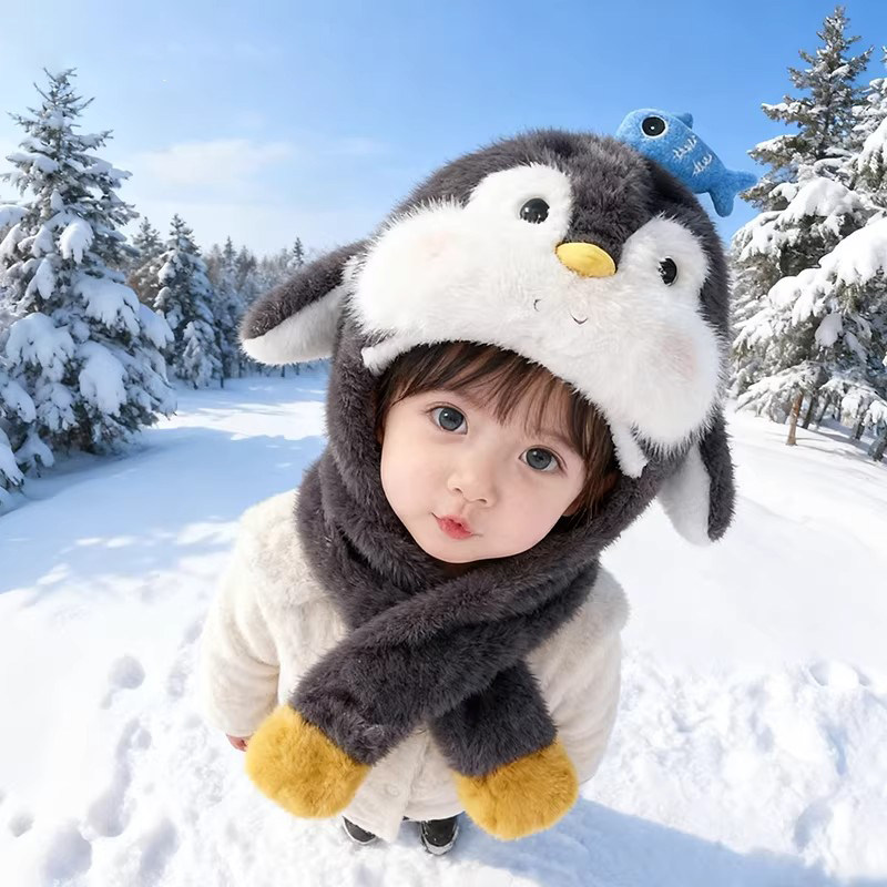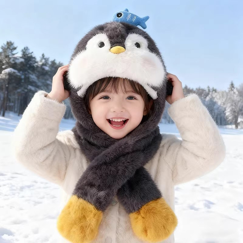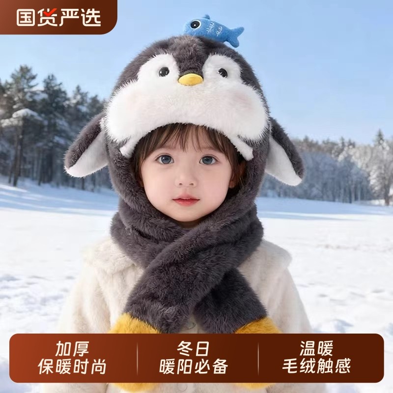📚 儿童帽子围巾一体可爱企鹅毛绒帽会动的冬季加绒保暖护耳帽男女童