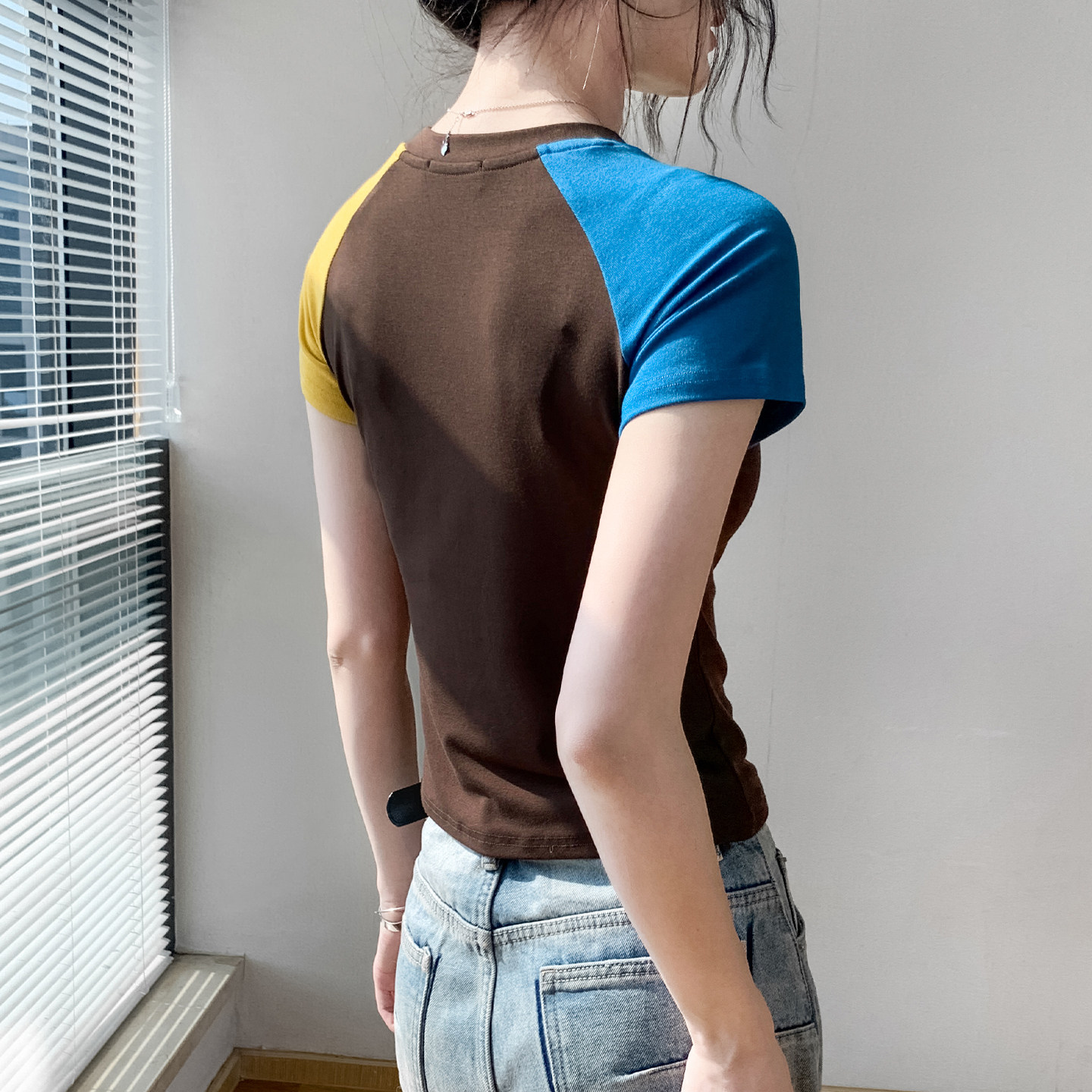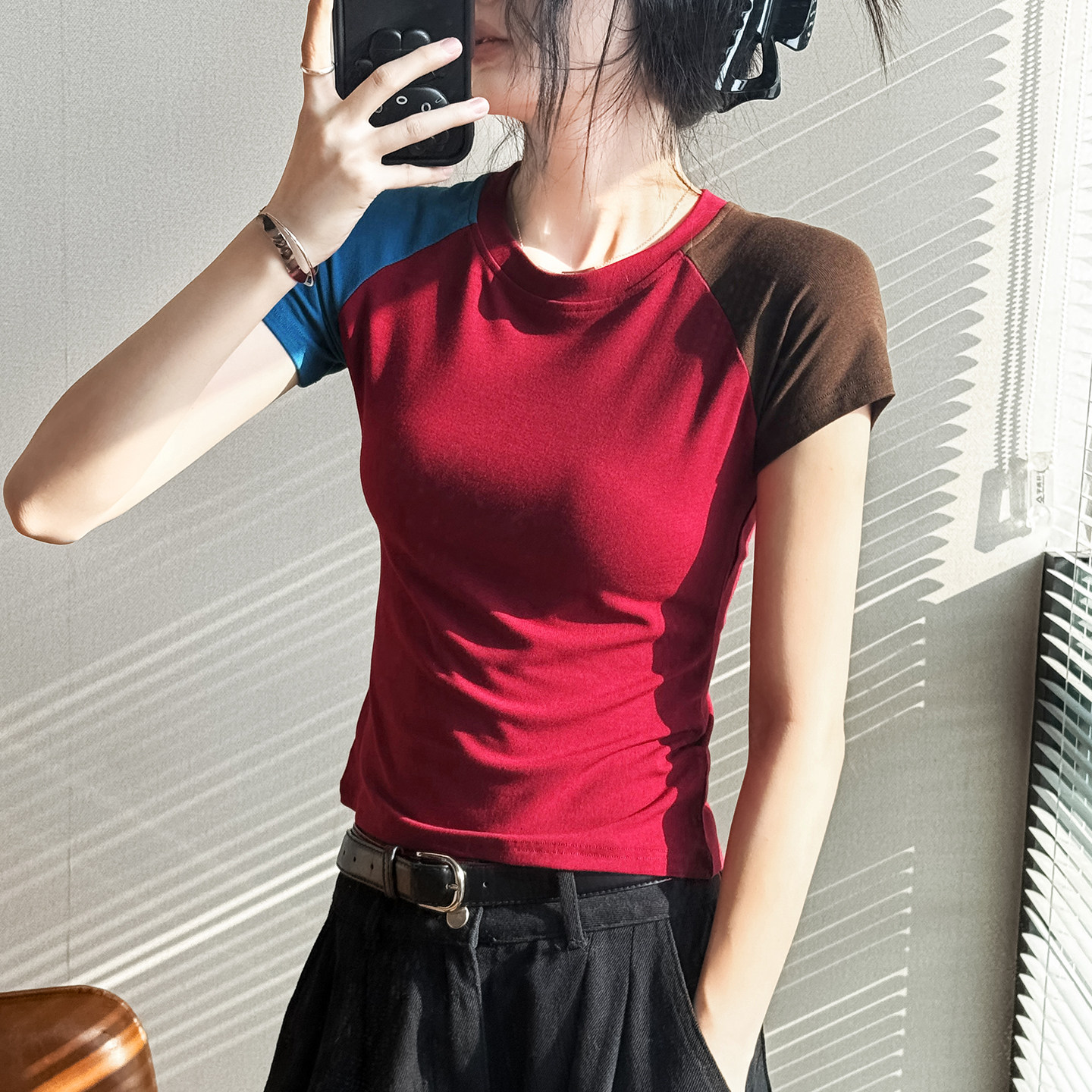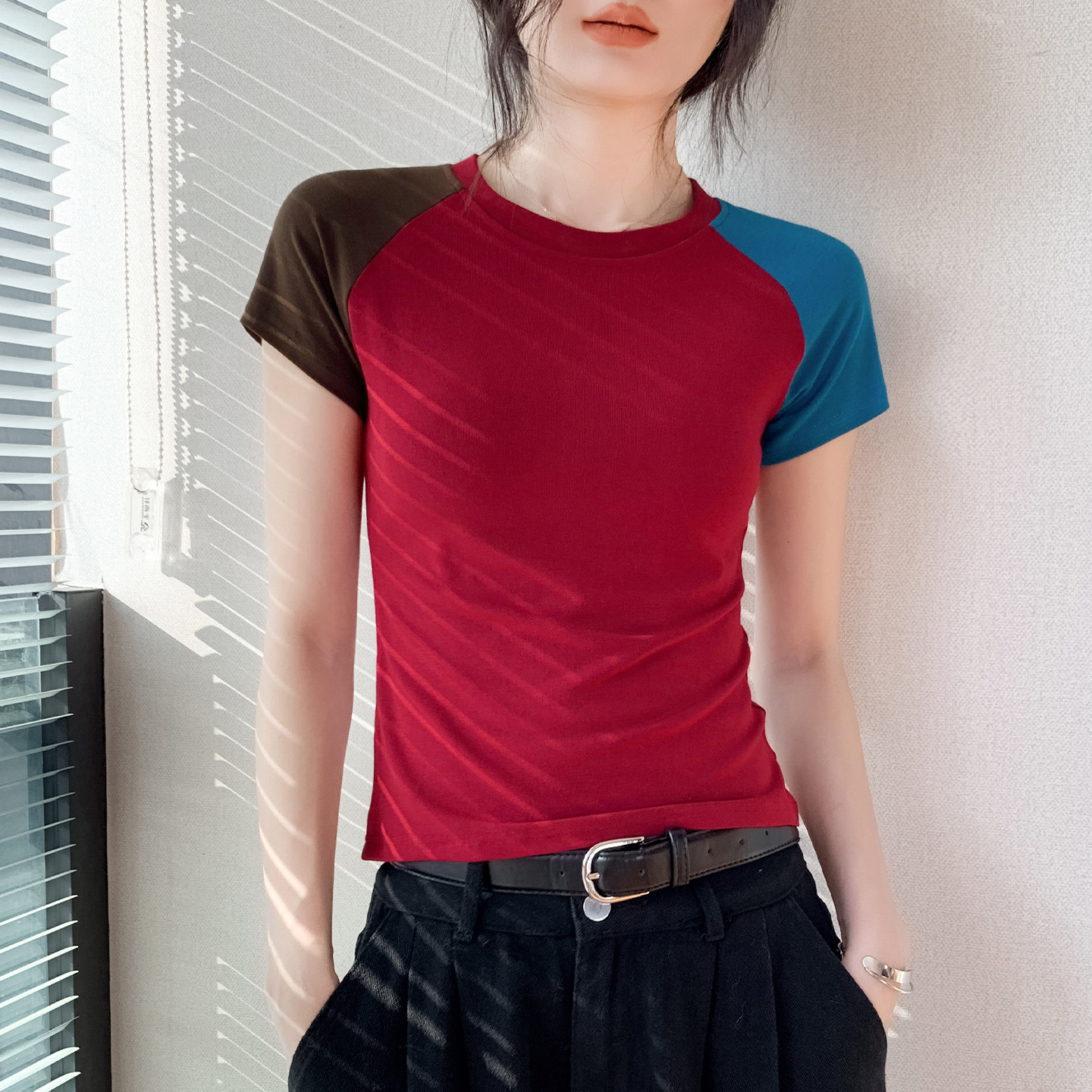 📚 撞色拼接圆领短袖T恤女多巴胺穿搭2026春季新款修身今年流行上衣