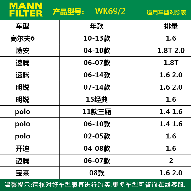 📚 曼牌汽油滤芯WK69/2适用大众高尔夫6途安polo明锐开迪燃油滤清器