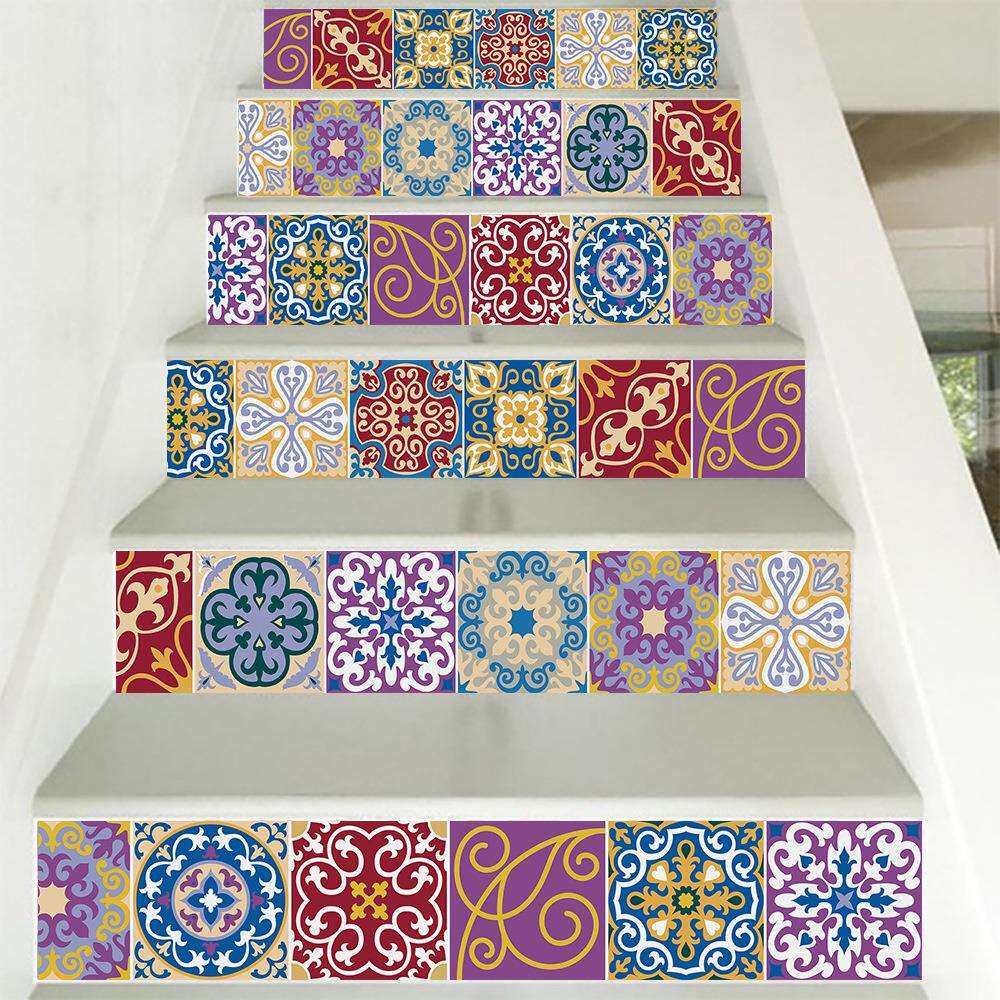 📚 彩色花砖图案楼梯贴踏步台阶装饰墙贴自粘可移除PVC壁画墙纸LT078