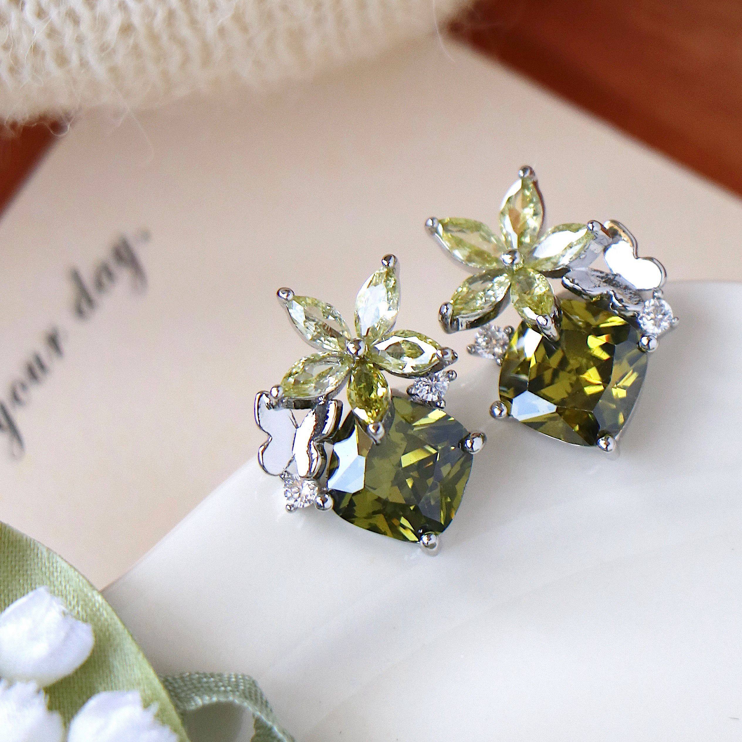📚 莉夏橄榄绿锆石蝴蝶耳钉森系清新精致耳饰耳环法式复古蚊香盘耳夹