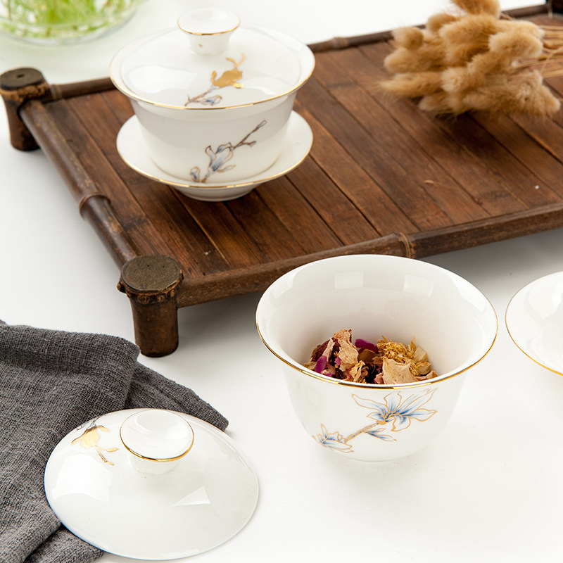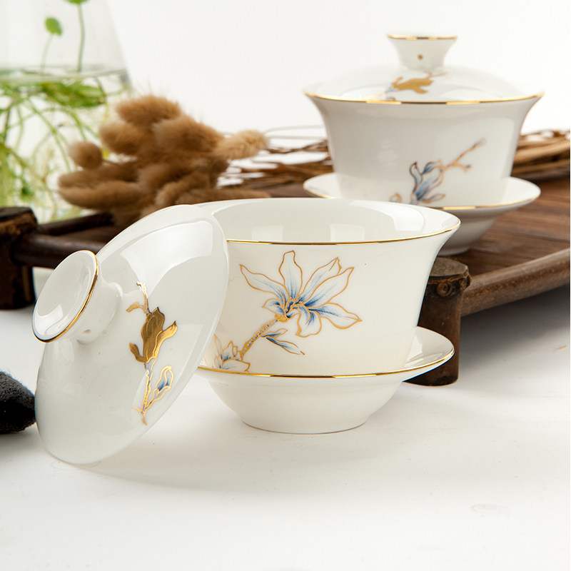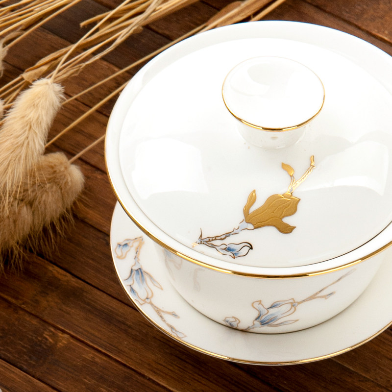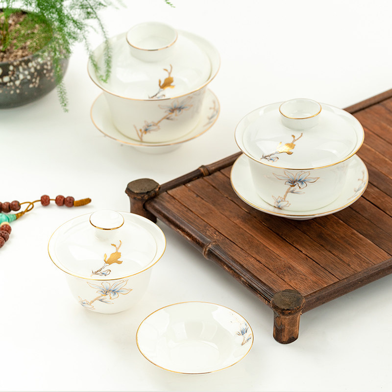 📚 金岚玉骨瓷三才盖碗茶杯功夫茶具金玉兰花茶碗敬茶杯小三才盖碗