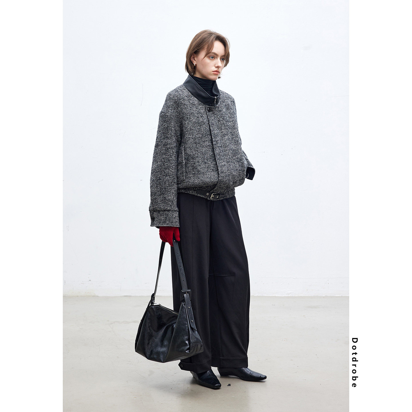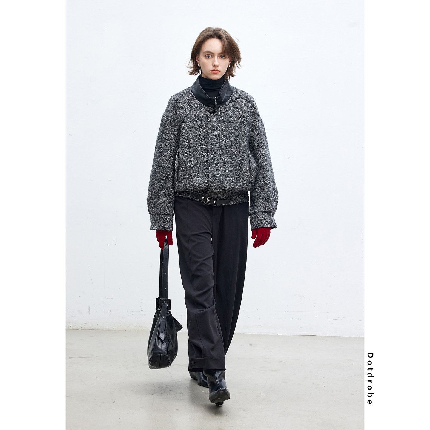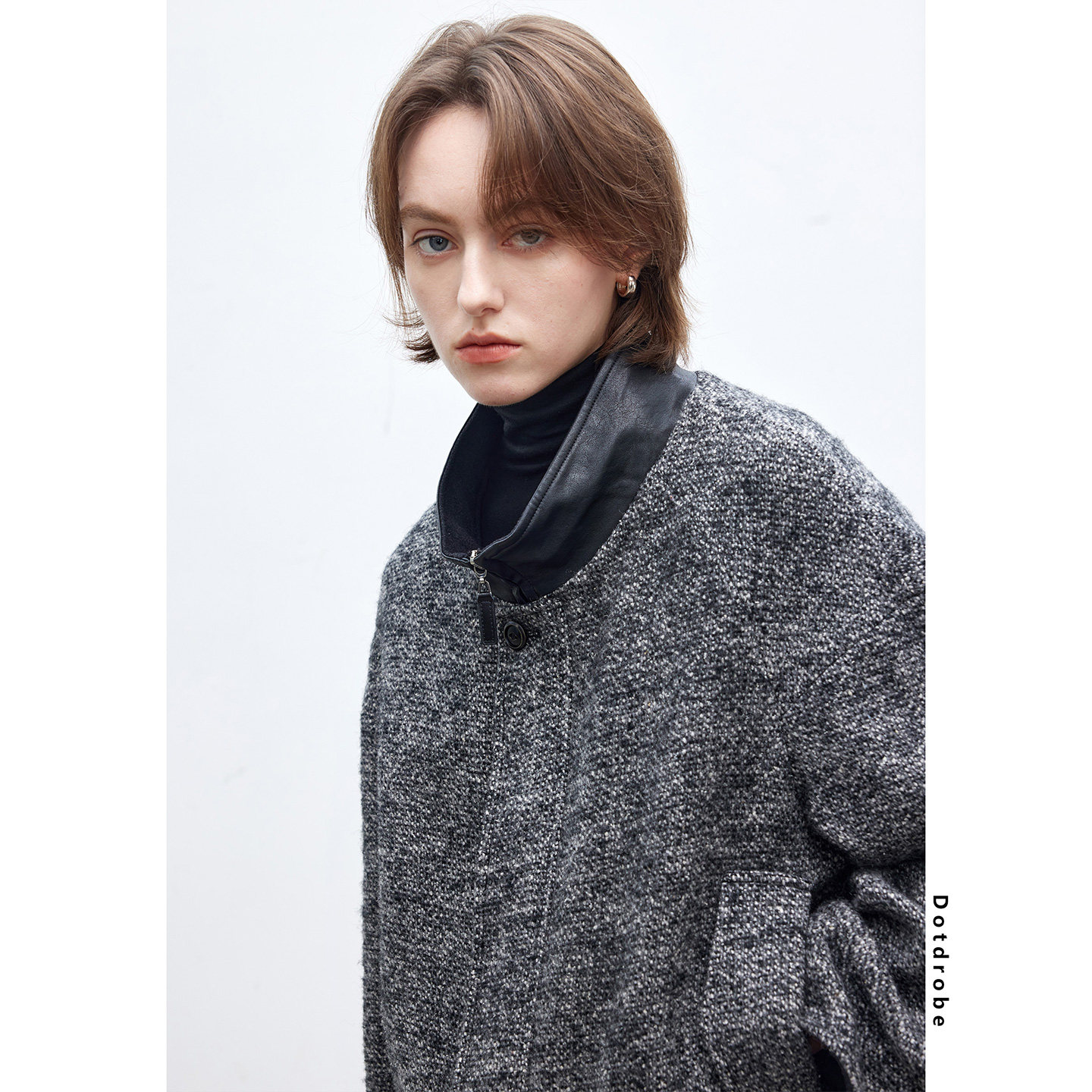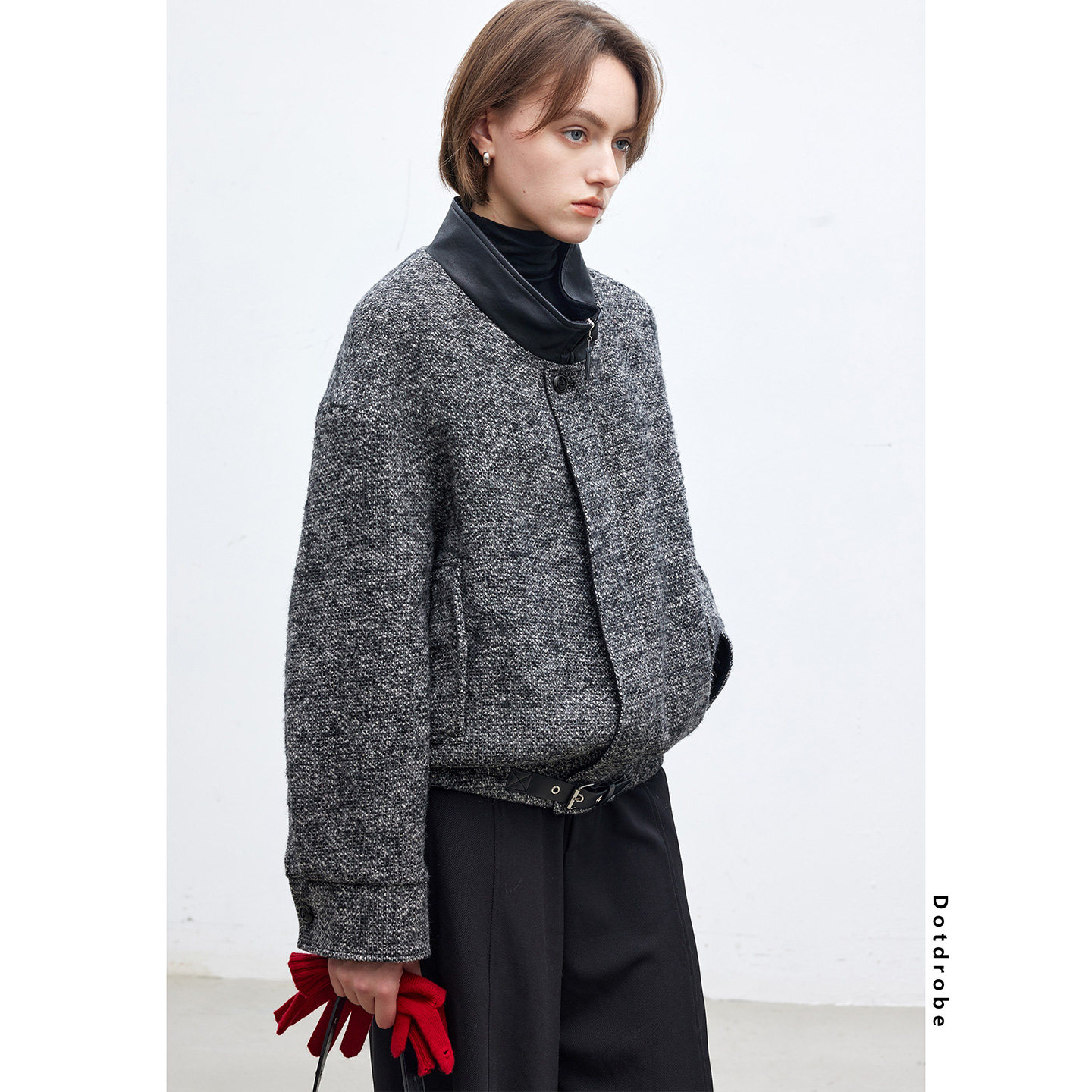 📚 Dotdrobe多着 羊毛混纺 拼接皮领短款毛呢外套女秋冬落肩袖-黑灰