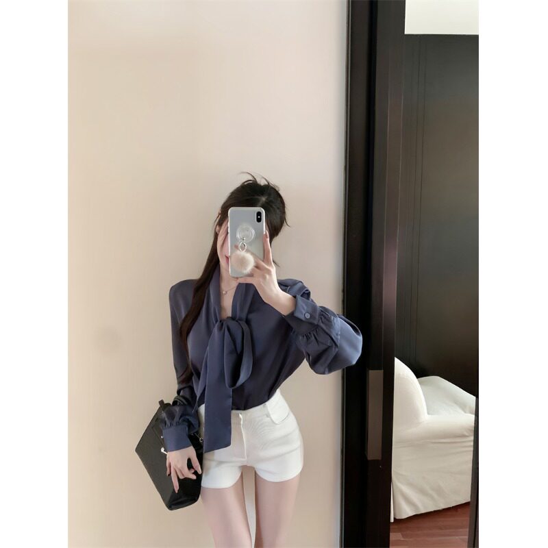 📚 法式丝绸缎面垫肩长袖衬衫女早秋白色衬衣温柔风设计感蝴蝶结上衣