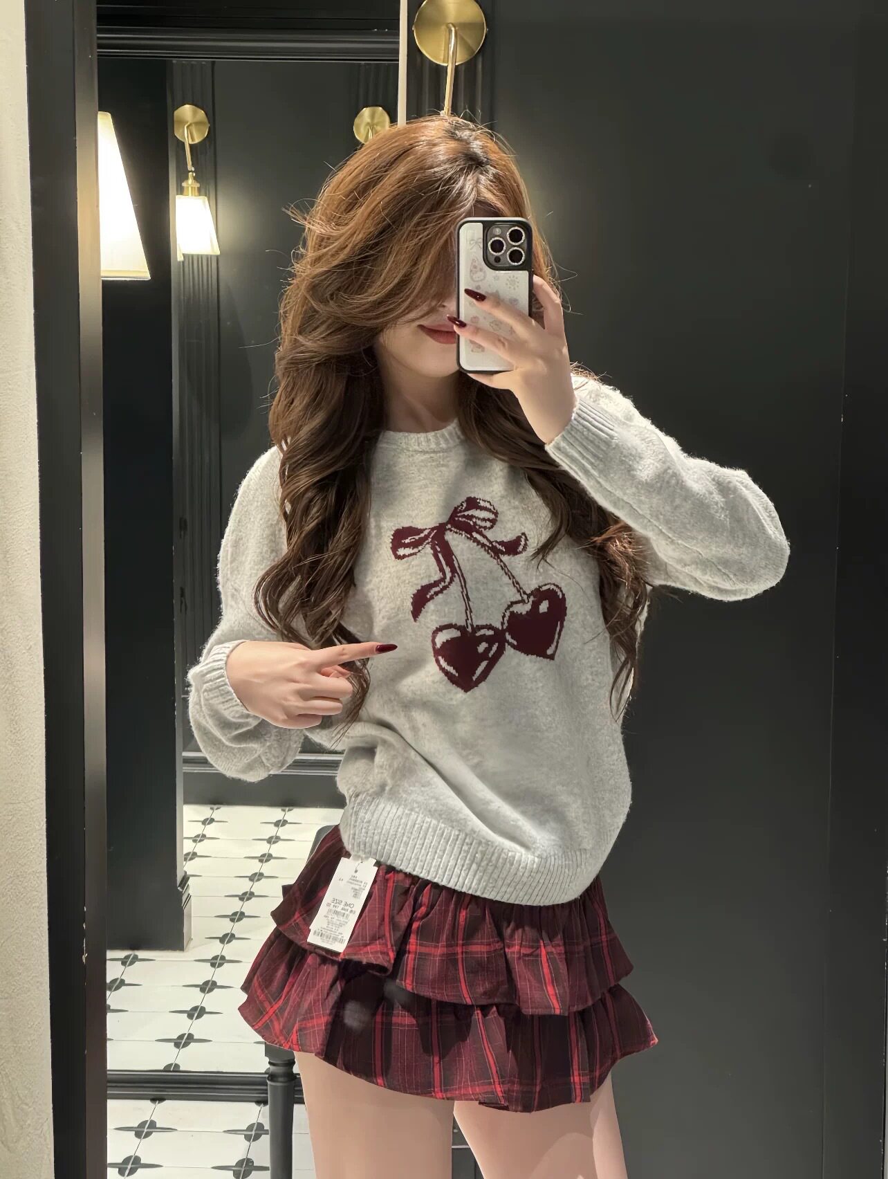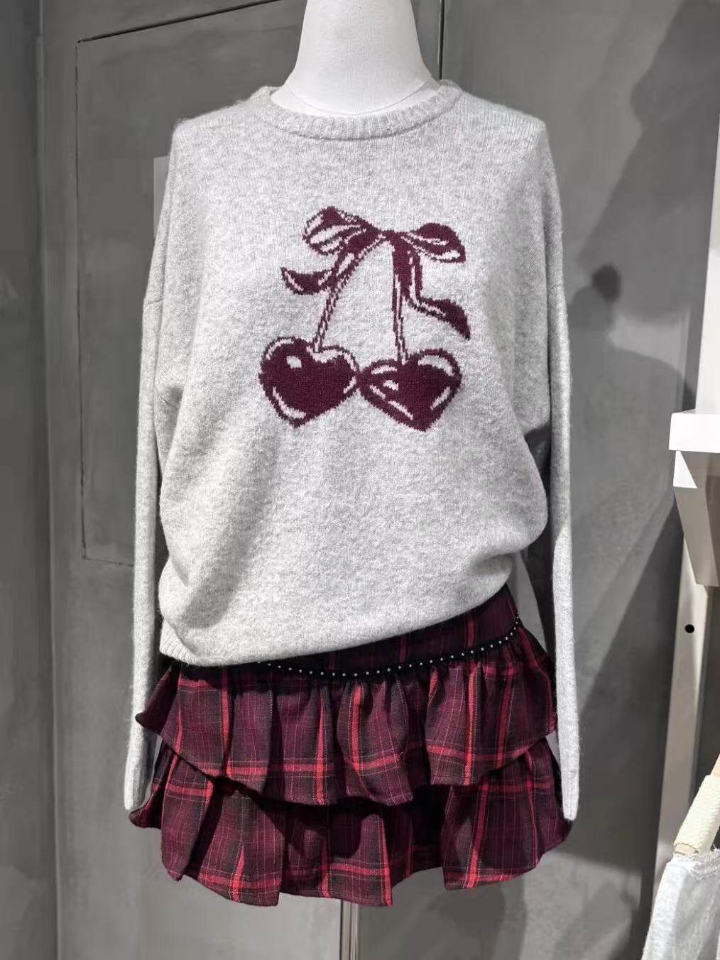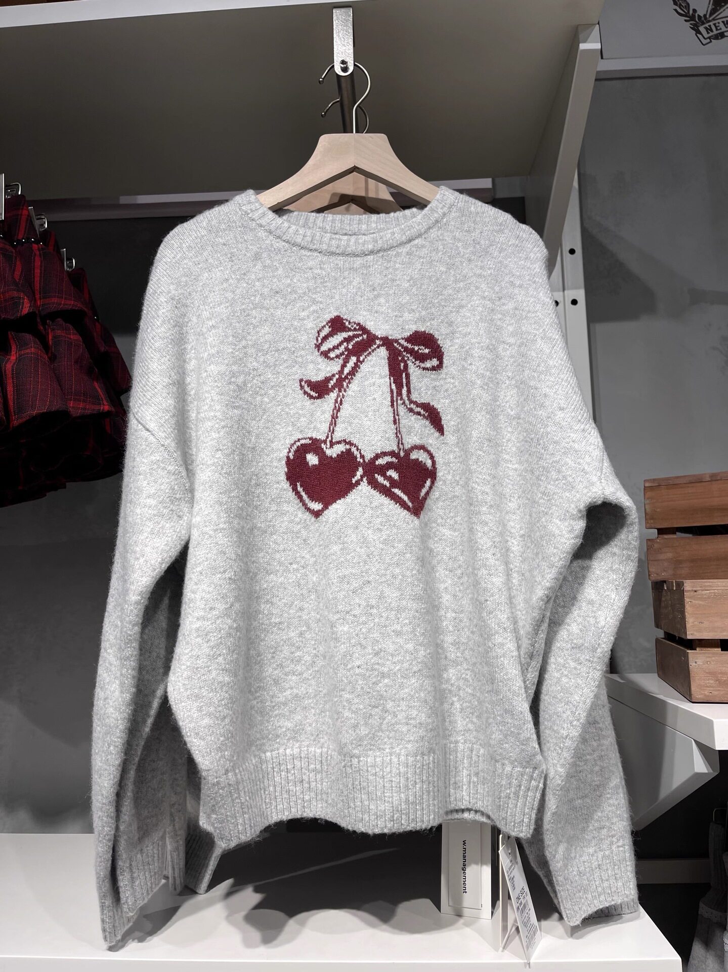 📚 BrandyGirl美式复古樱桃蝴蝶结wm针织衫女圆领宽松毛衣灰色上衣潮