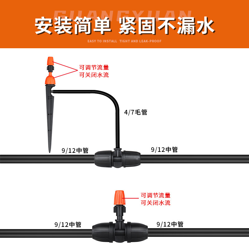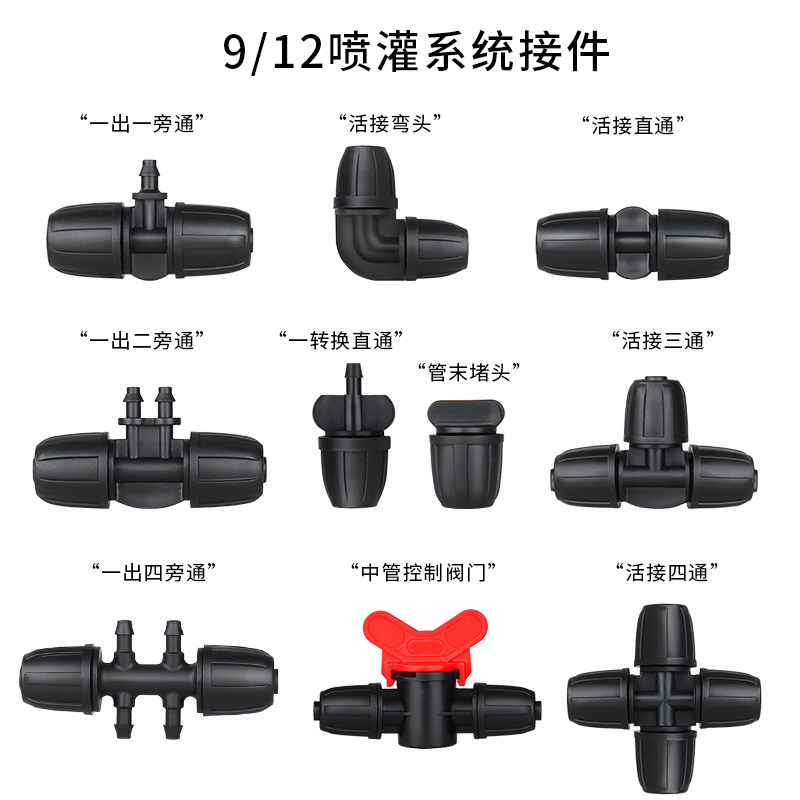 📚 9/12mm中管简易接件接头微喷滴灌弯通三通直通堵头阀门一出一旁通
