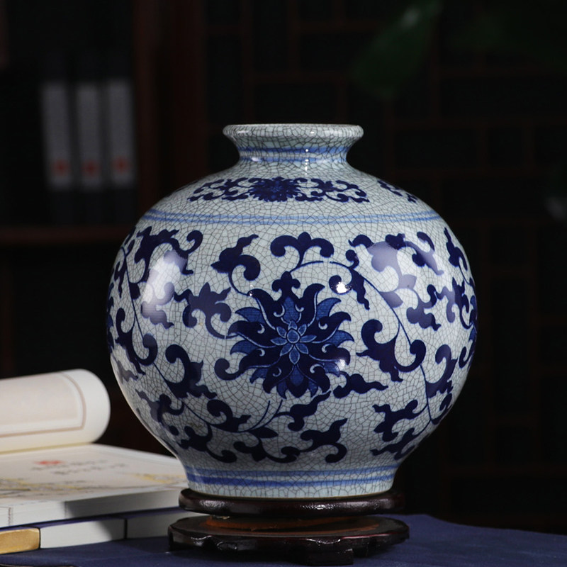 📚 景德镇陶瓷器仿古青花瓷花瓶摆件客厅新中式复古裂纹釉官窑插花瓶