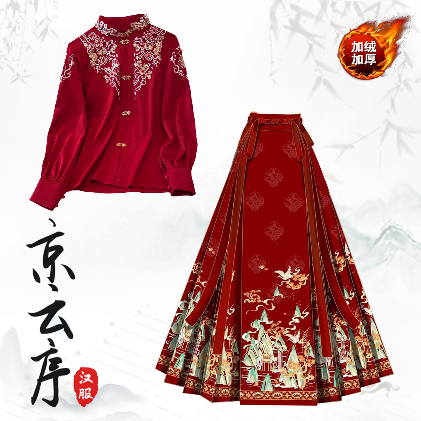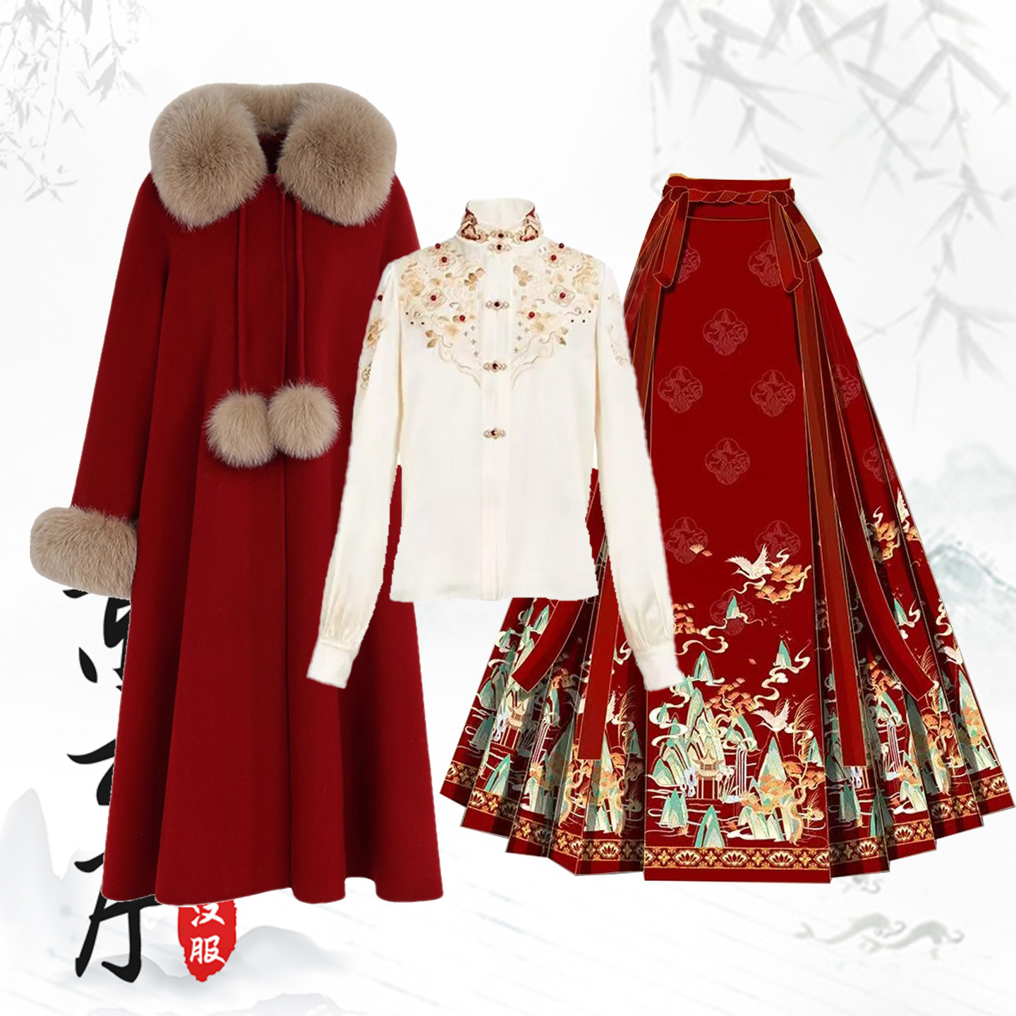 📚 新中式汉服红色喜庆三件套敬酒服婚服重工刺绣上衣长款大衣马面裙