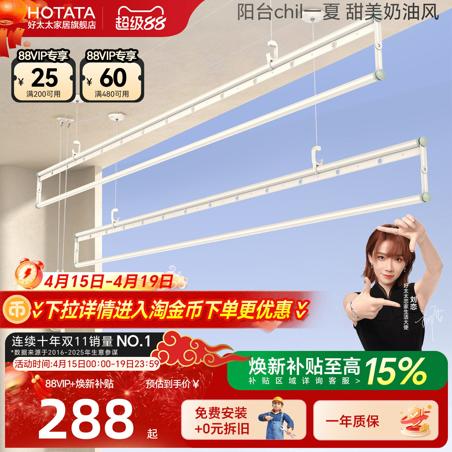 📚 好太太升降晾衣架铝合金三杆手摇升降室内阳台晾晒架免费安装