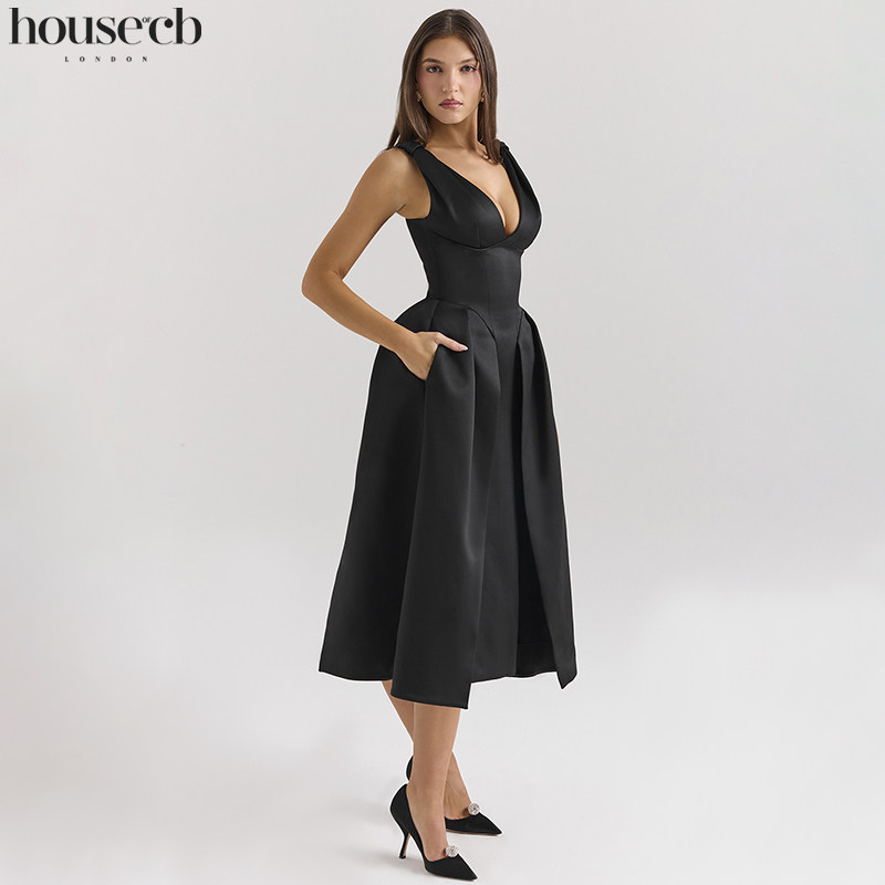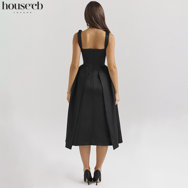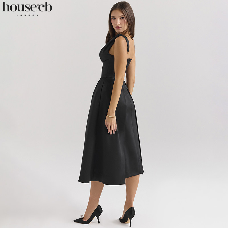 📚 House of CB 优雅奢华黑色缎面中长连衣裙Paloma
