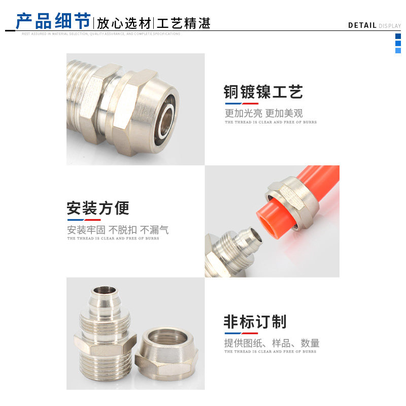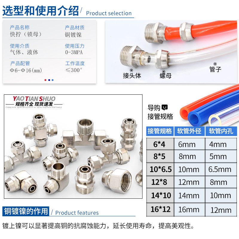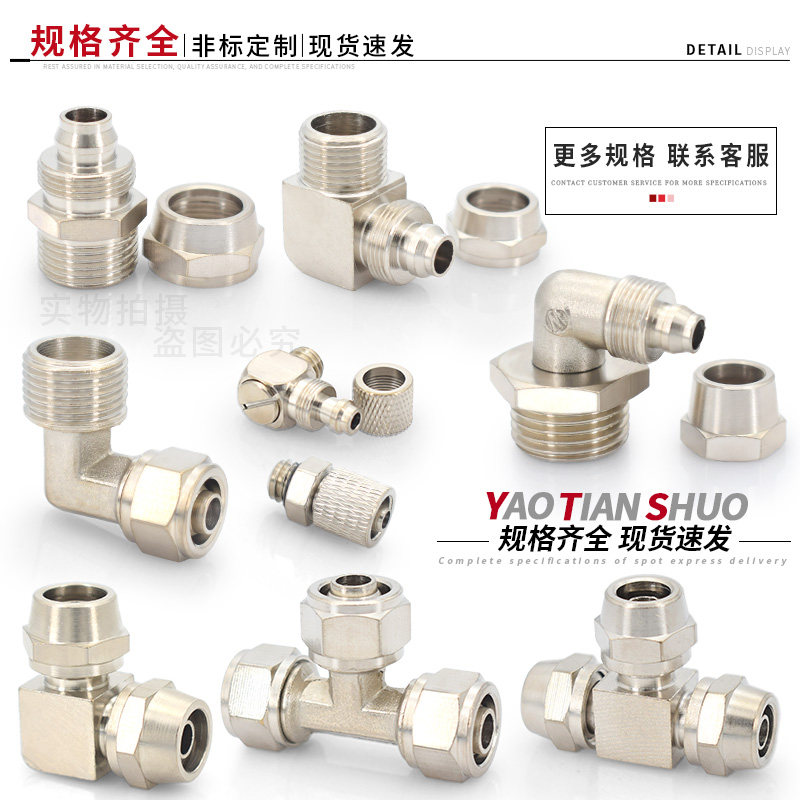 📚 铜镀镍快拧TF锁母锁母压铸体变径三通6/8/10/12/16mmPU气动管接头