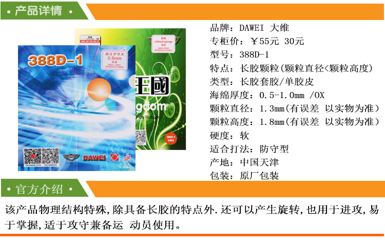 📚 DAWEI大维388D-1长胶套胶388D1固化胶皮颗粒乒乓球拍训练长胶套胶