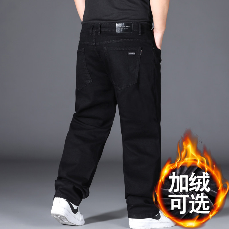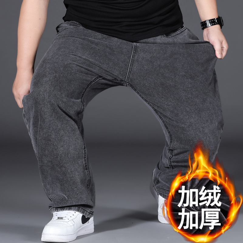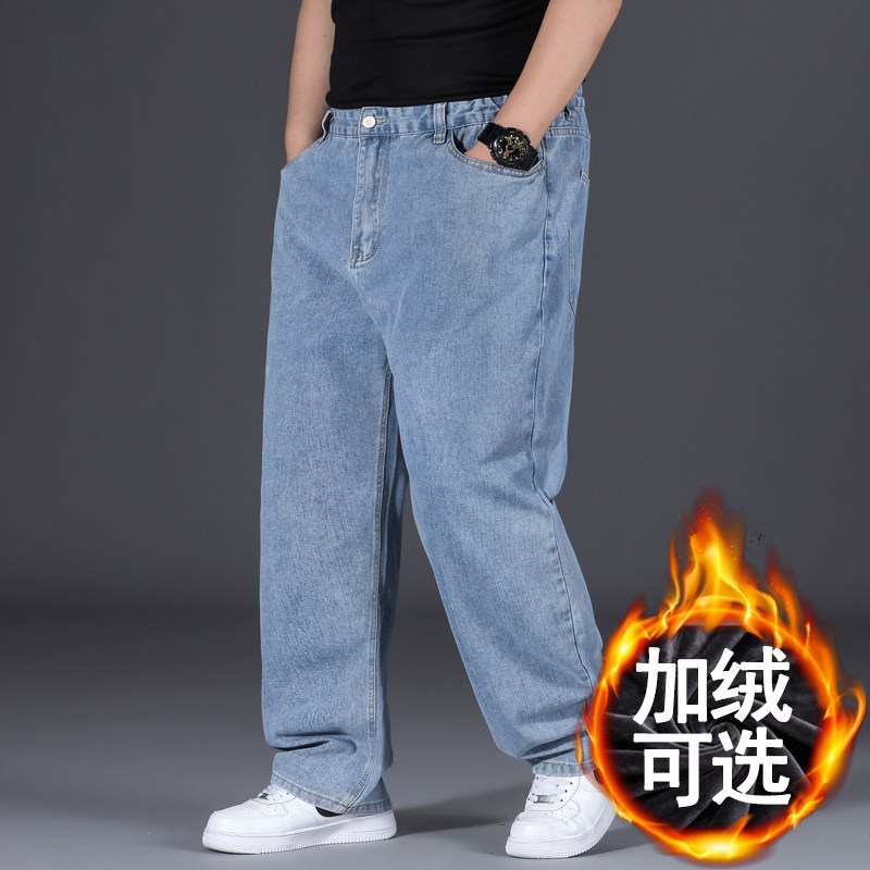 📚 秋冬款加绒加厚牛仔裤男宽松直筒加肥加大码胖子肥佬深蓝色长裤子