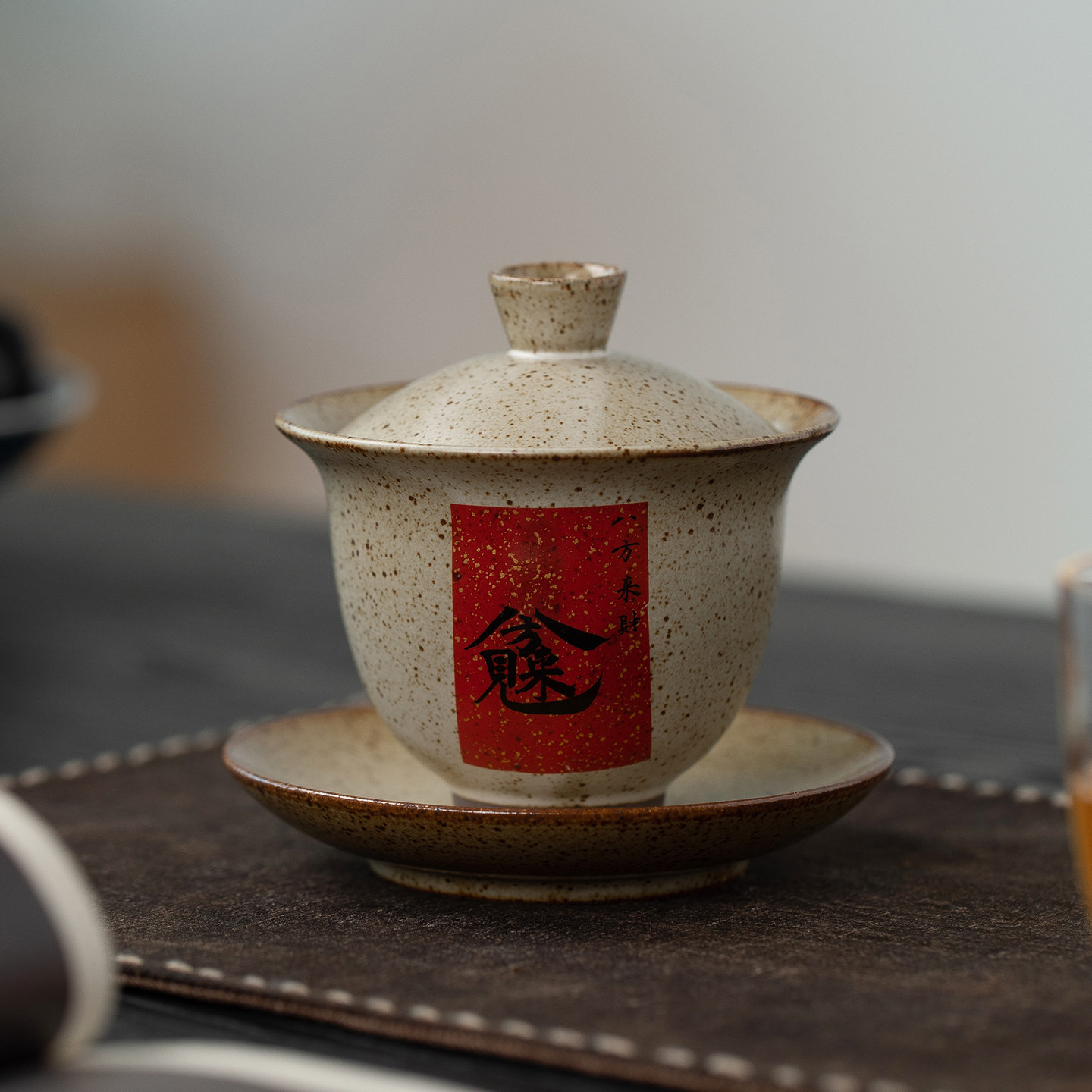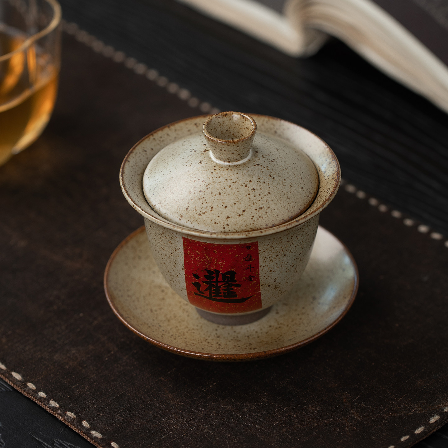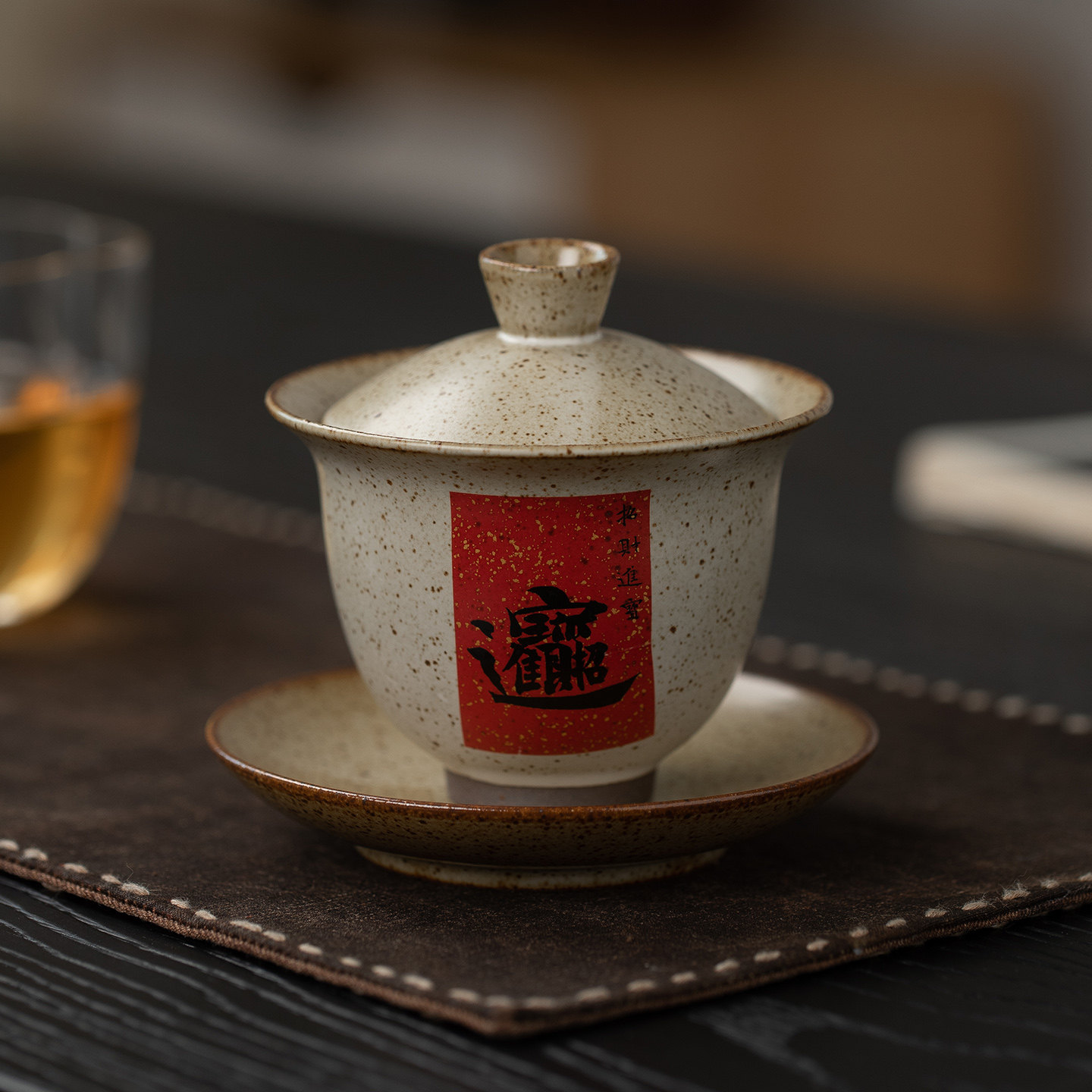 📚 粗陶书法日进斗金招财进宝盖碗不烫手盖碗茶三才带盖陶瓷定制logo