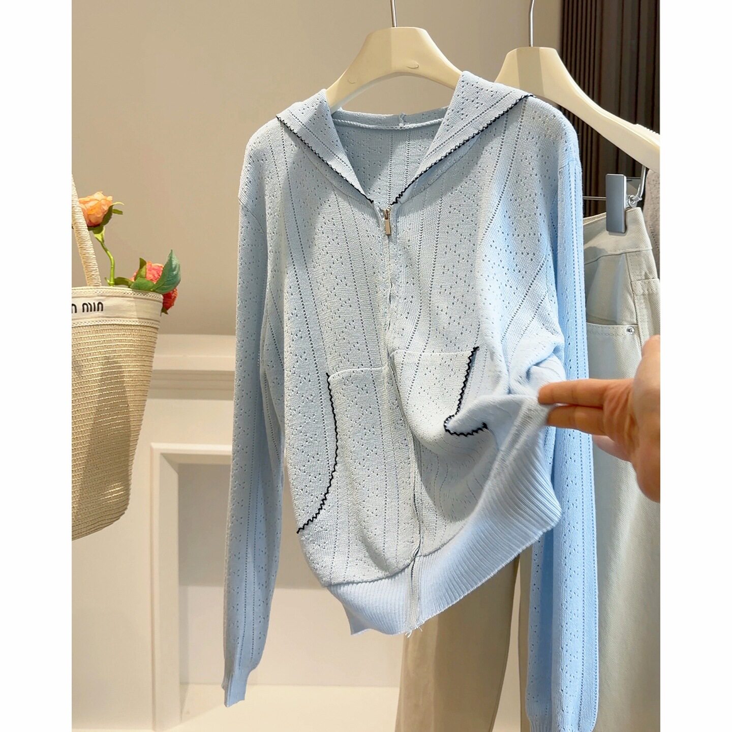 📚 薄款连帽拉链镂空针织开衫女春夏季新款韩版穿搭减龄显瘦外搭上衣